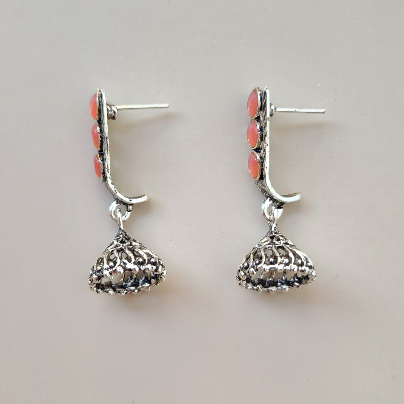 Bold yet graceful, our German Silver Earrings are a tribute to heritage craftsmanship with a modern twist. Featuring a trio of coral-toned stones set vertically in a sleek silver-toned frame, these earrings cascade into an intricately filigreed dome—evoking the classic jhumka silhouette with a contemporary edge.