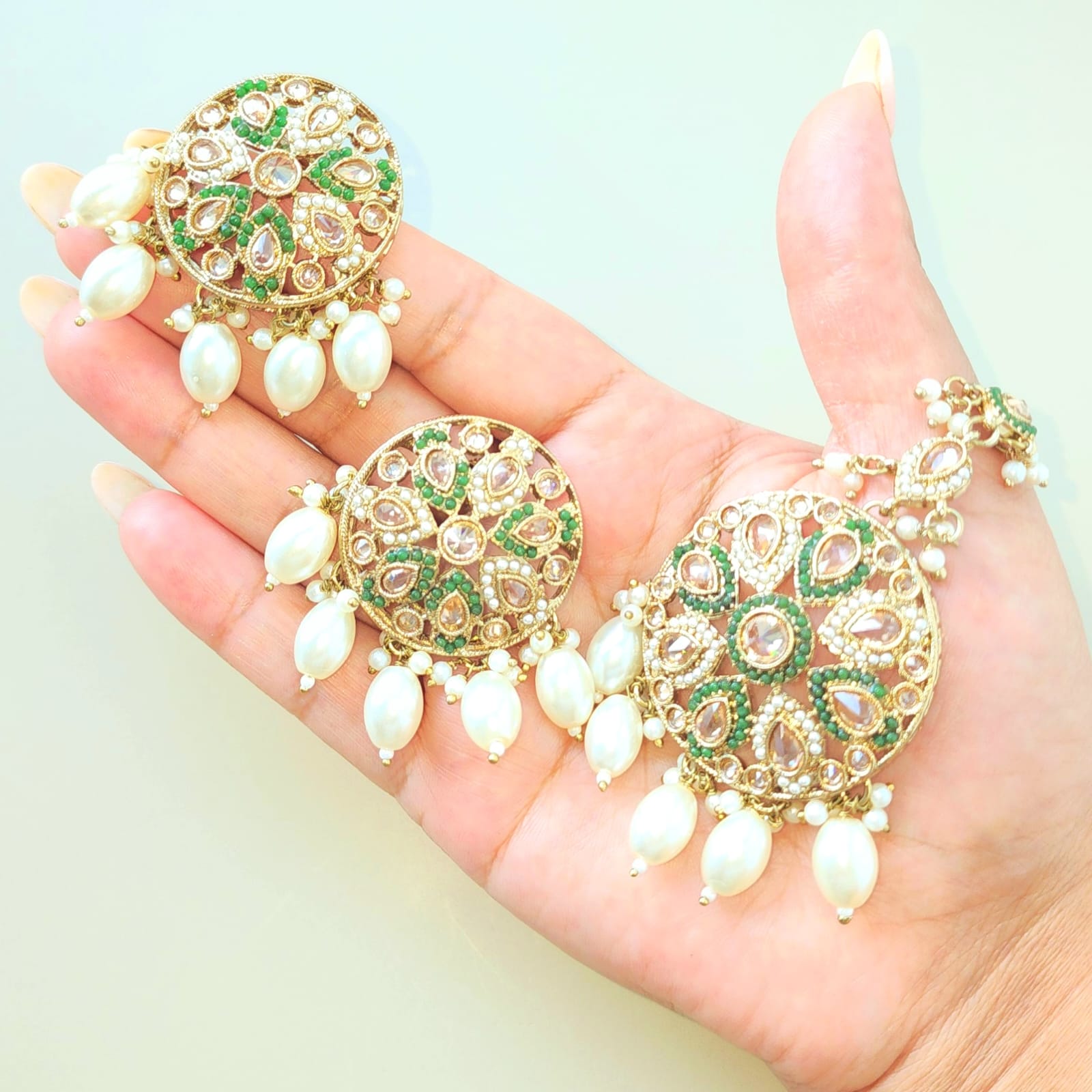A radiant ode to tradition, our Meherbaan Polki Necklace Set is crafted to enchant. This regal ensemble includes a statement necklace, matching earrings, and a coordinating maang tikka—each piece meticulously designed in a gold-tone finish and adorned with luminous Polki stones.