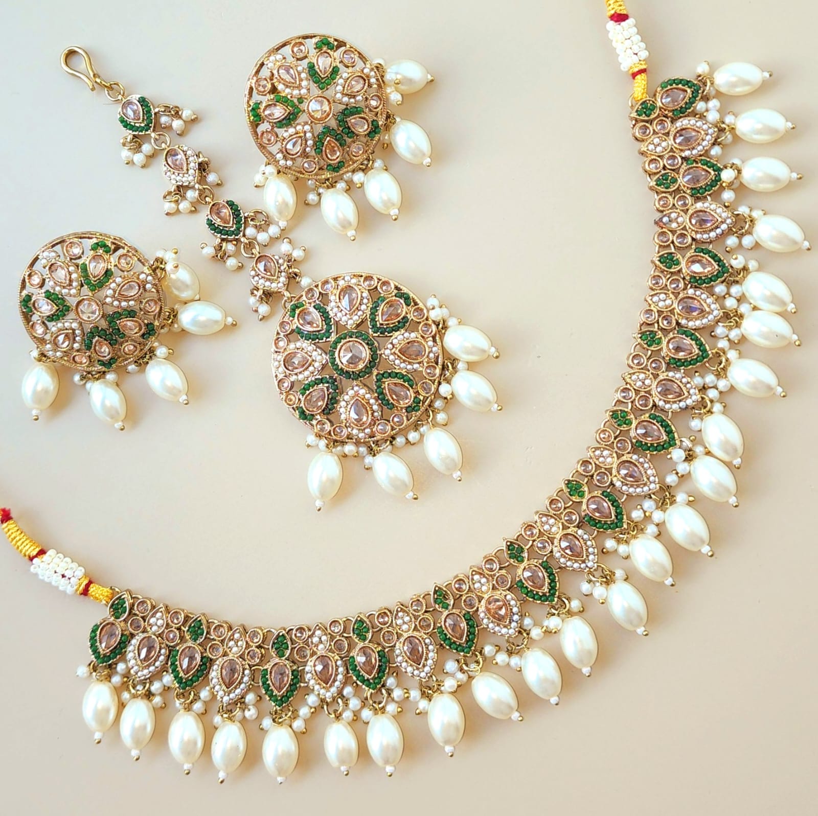 Floral and teardrop motifs bloom across the necklace, while vibrant pink and green enamel accents add a joyful splash of colour. Clusters of pearl-like beads sway gently from each piece, infusing movement and grace into the design. Whether you're dressing for a wedding, sangeet, or festive celebration, this set promises to turn heads and capture hearts.