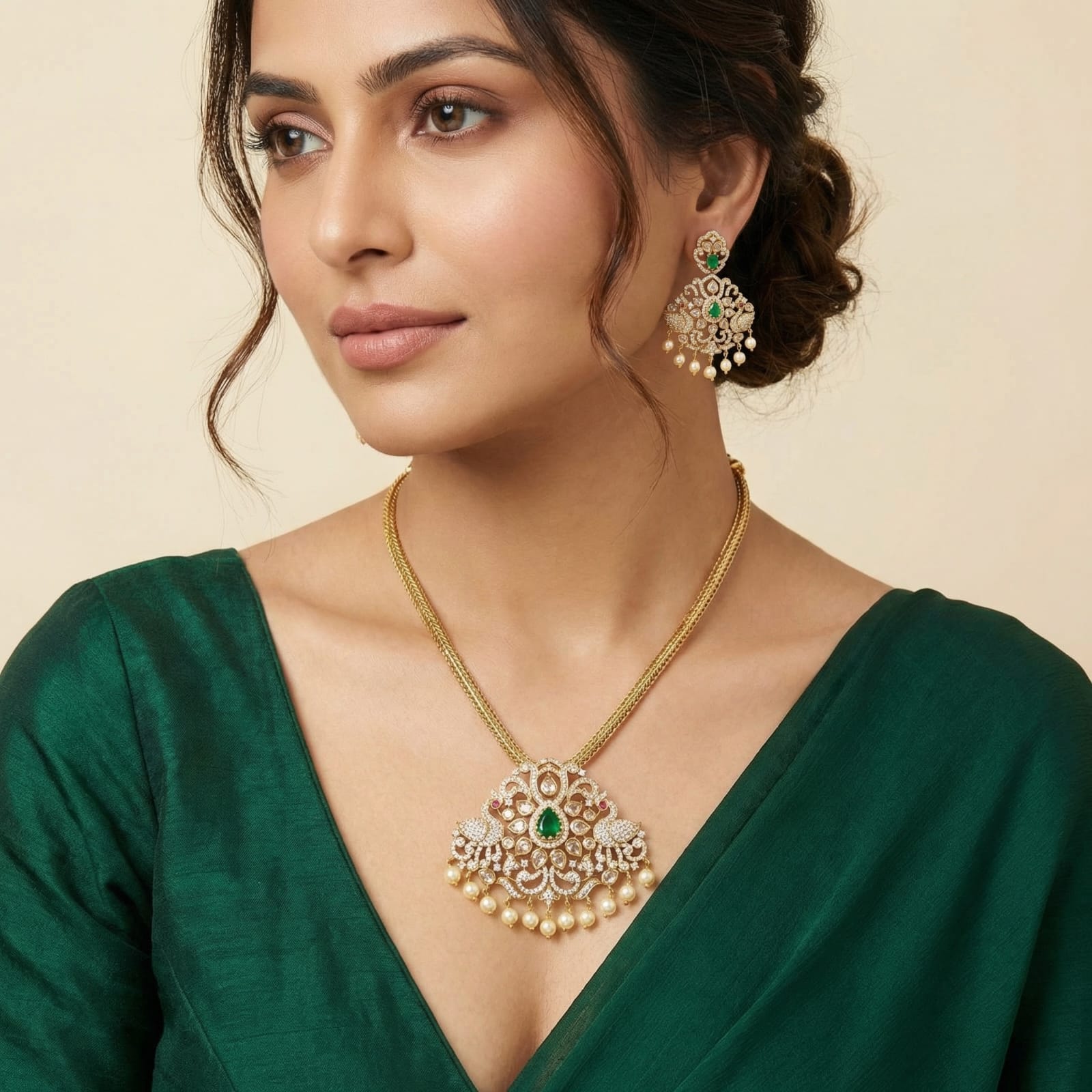 Studded with radiant CZ diamond simulants and shimmering moissanite drop stones, the necklace glows with lifelike brilliance. At its heart lies a rich green gemstone, adding a royal touch to the intricate gold-toned design. The pendant’s floral and peacock detailing is enhanced by delicate pearl-like drops, creating a look that’s both opulent and timeless.