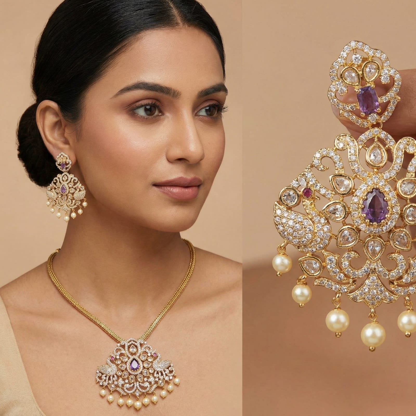 Studded with radiant CZ diamond simulants and shimmering moissanite drop stones, the necklace glows with lifelike brilliance. At its heart lies a rich purple gemstone, adding a royal touch to the intricate gold-toned design. The pendant’s floral and peacock detailing is enhanced by delicate pearl-like drops, creating a look that’s both opulent and timeless.