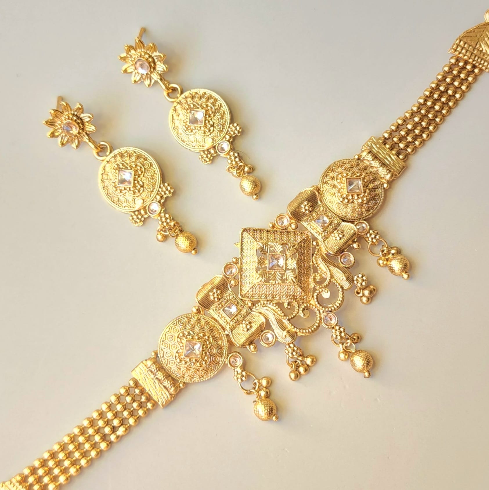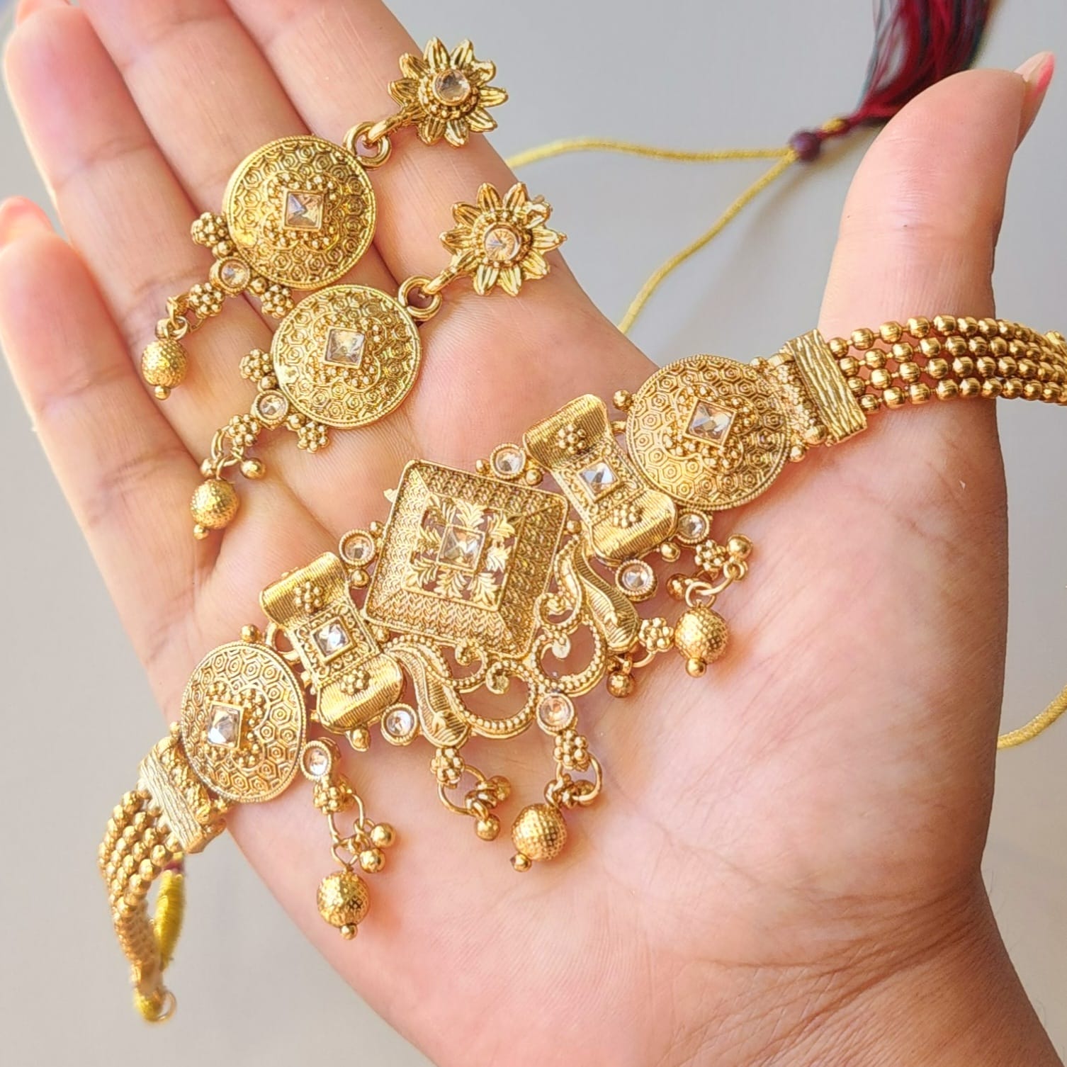 The centrepiece is complemented by elegant multi‑strand chains that add fluidity, richness, and a regal silhouette. Paired with the choker are matching earrings measuring 6 cm in length, featuring a floral top, intricately carved circular motif, and delicate dangling beads that sway gracefully with every movement.