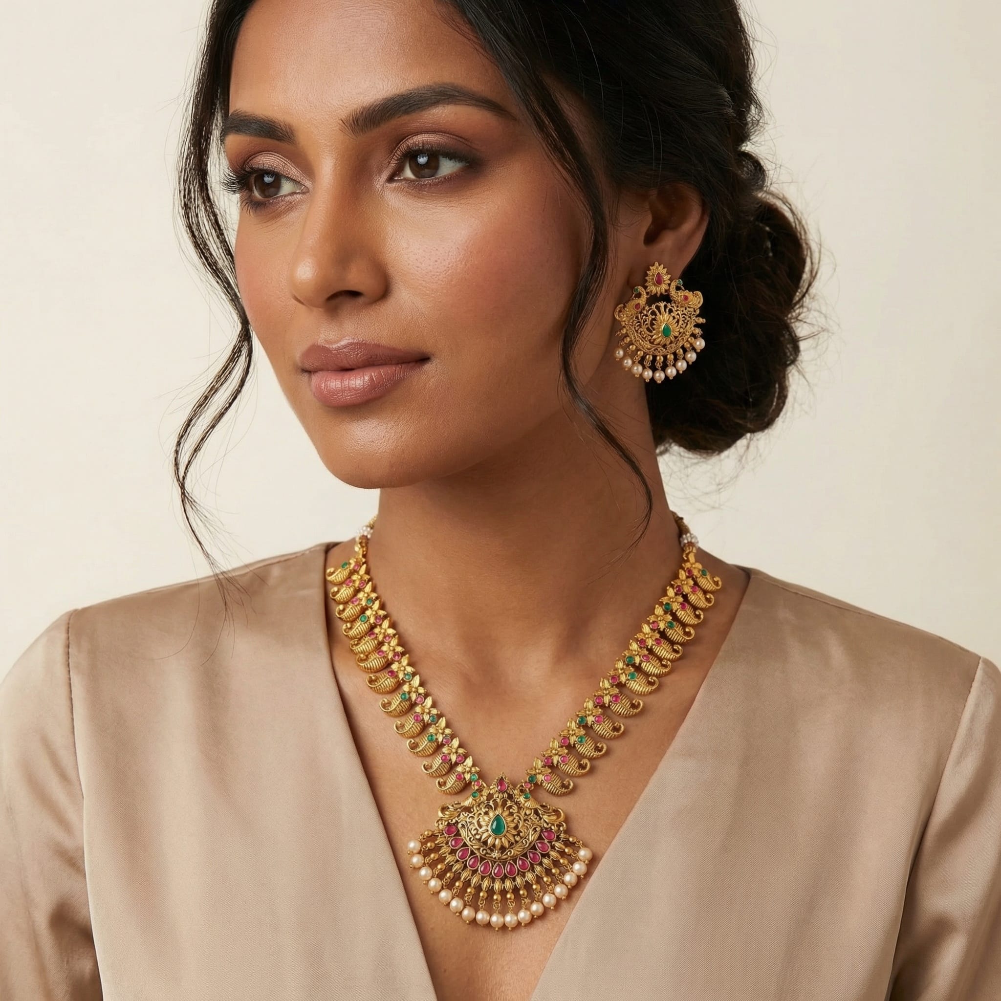 The intricately designed gold-toned necklace is embellished with rich green and ruby-hued Kemp stones, adding a regal touch. Delicate pearl droplets enhance its traditional appeal, making it the perfect statement piece for weddings, festive occasions, and grand celebrations.