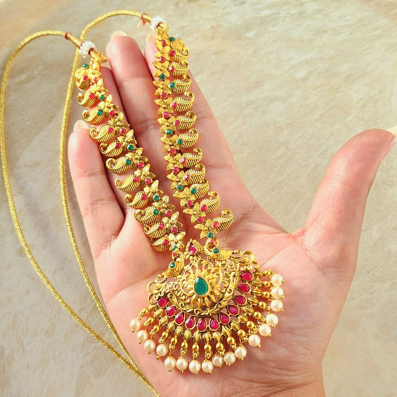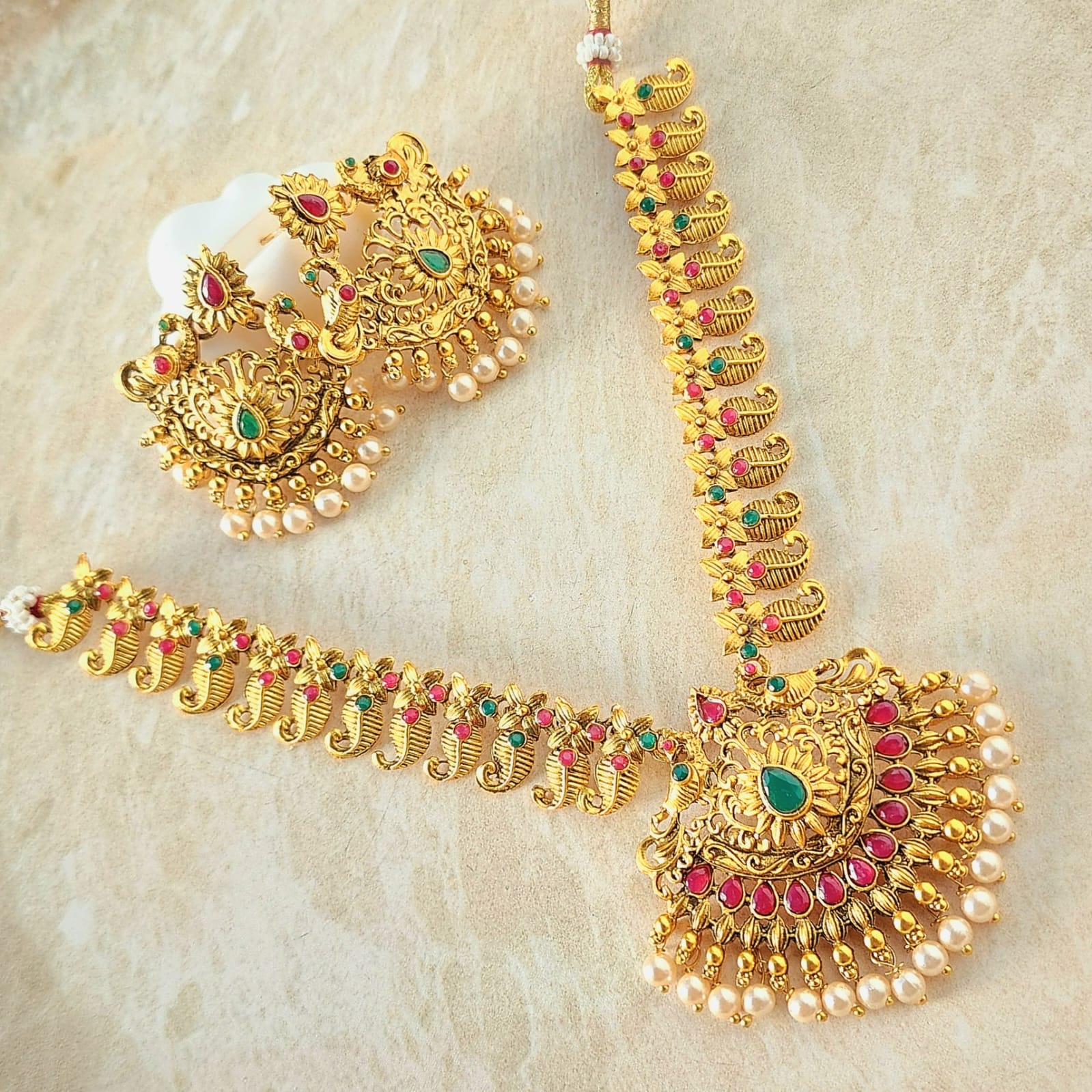The intricately designed gold-toned necklace is embellished with rich green and ruby-hued Kemp stones, adding a regal touch. Delicate pearl droplets enhance its traditional appeal, making it the perfect statement piece for weddings, festive occasions, and grand celebrations.