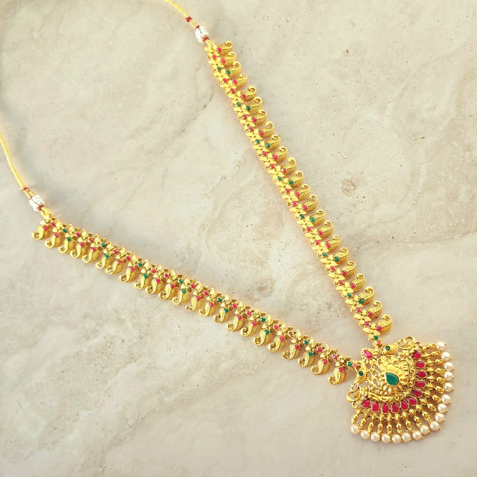 The intricately designed gold-toned necklace is embellished with rich green and ruby-hued Kemp stones, adding a regal touch. Delicate pearl droplets enhance its traditional appeal, making it the perfect statement piece for weddings, festive occasions, and grand celebrations.