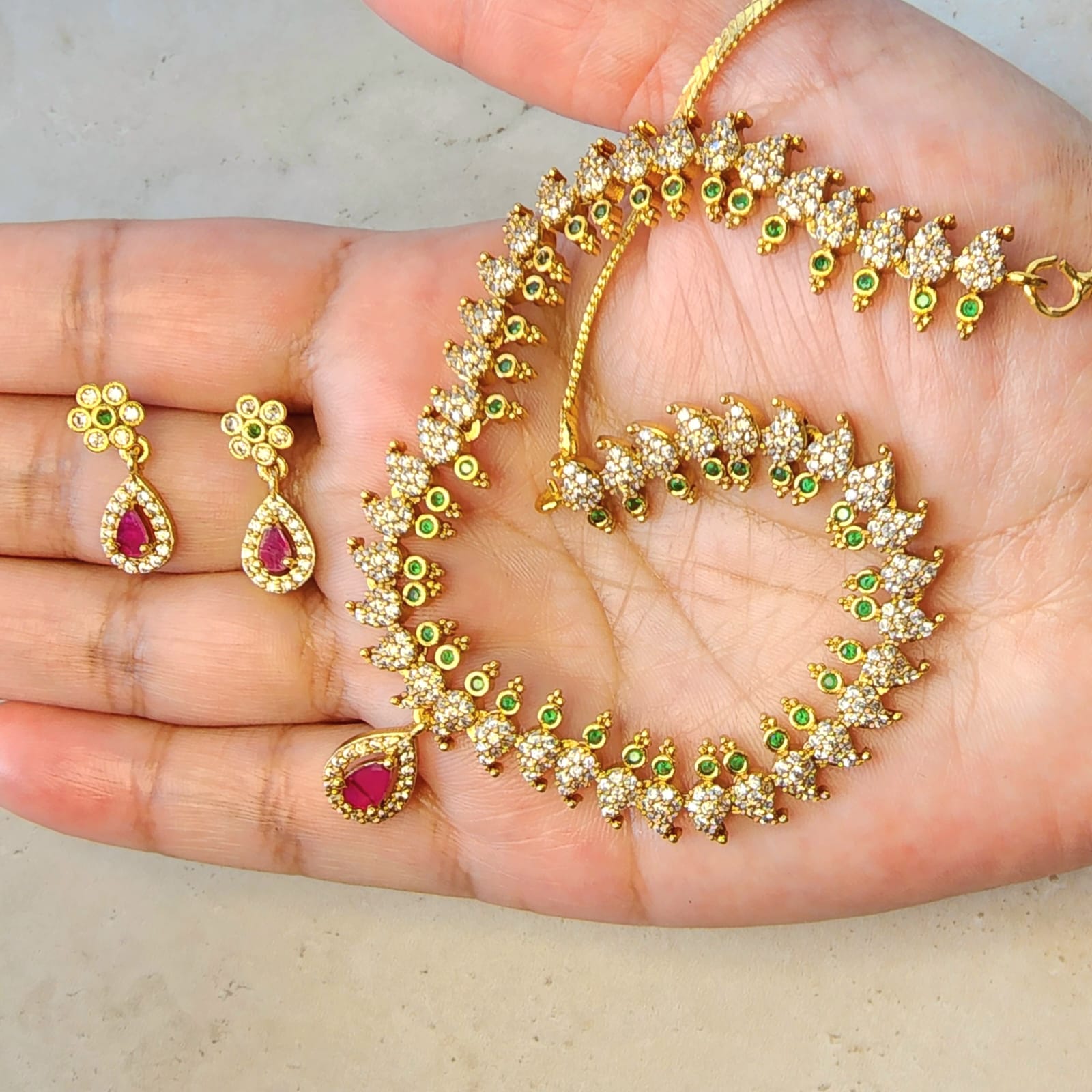 Step into timeless splendor with our Regal Radiance Necklace Set, a masterpiece that captures the essence of Indian artistry with a modern twist. This ornate set features a dazzling array of diamond simulants nestled in a golden framework, accented with hints of green and crowned by a striking teardrop-shaped red stone at its center. The necklace’s symmetrical design evokes regal grandeur, making it a perfect choice for weddings, festive occasions, or cultural celebrations.