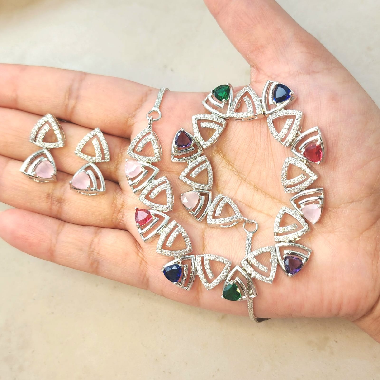 To complete the ensemble, matching earrings measuring 2.6 cm in length are designed to echo the triangle motif and sparkle of the necklace, ensuring a perfect pairing. Whether you're attending a lavish celebration or looking to add a touch of glamour to everyday wear, this set is destined to make you shine.