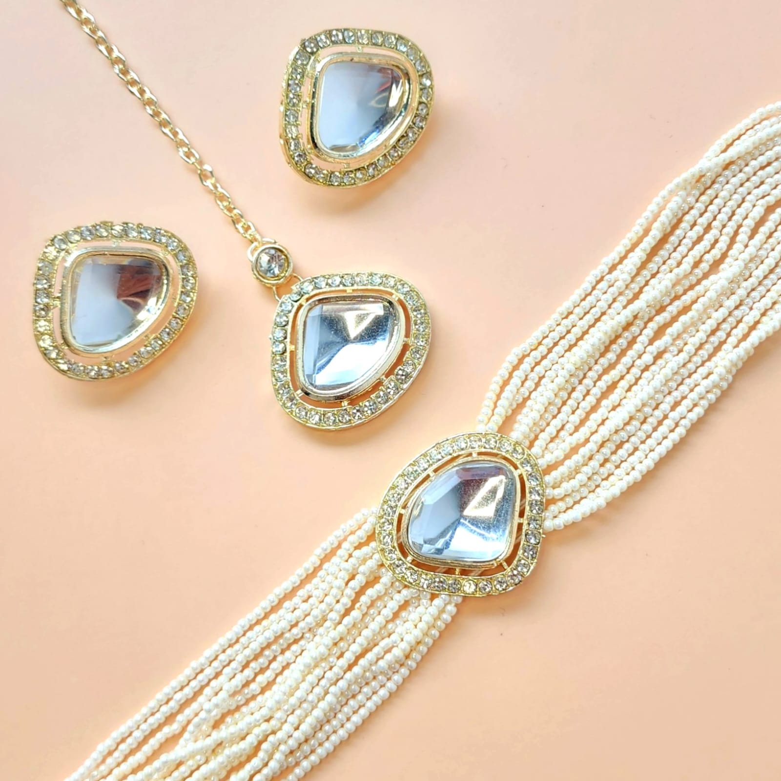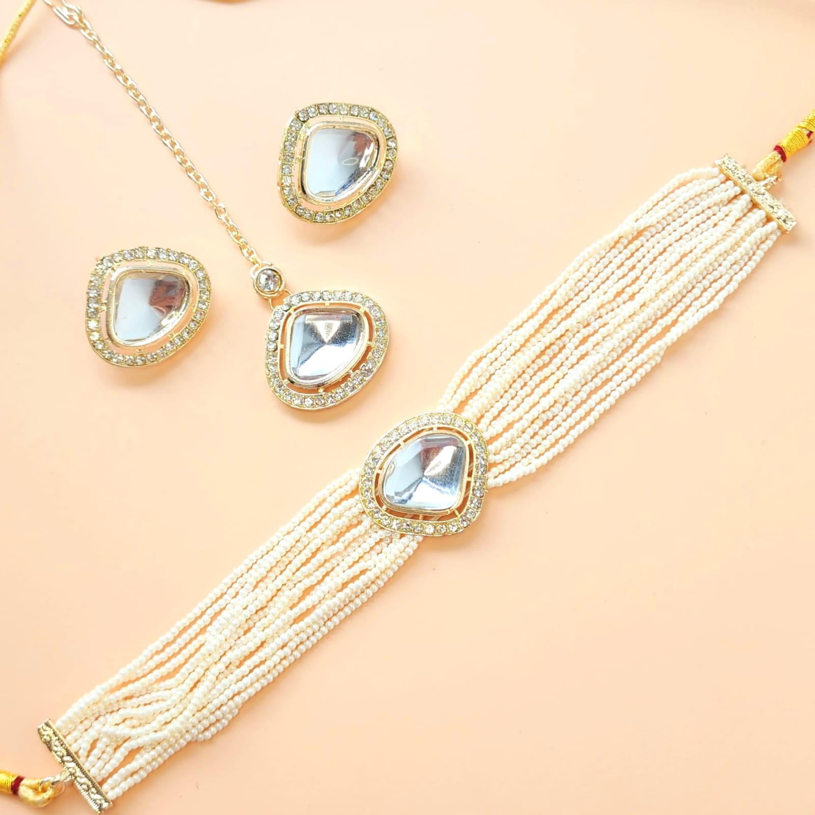 🤍 White Radiance: Choker Necklace Set with Earrings & Maang Tikka