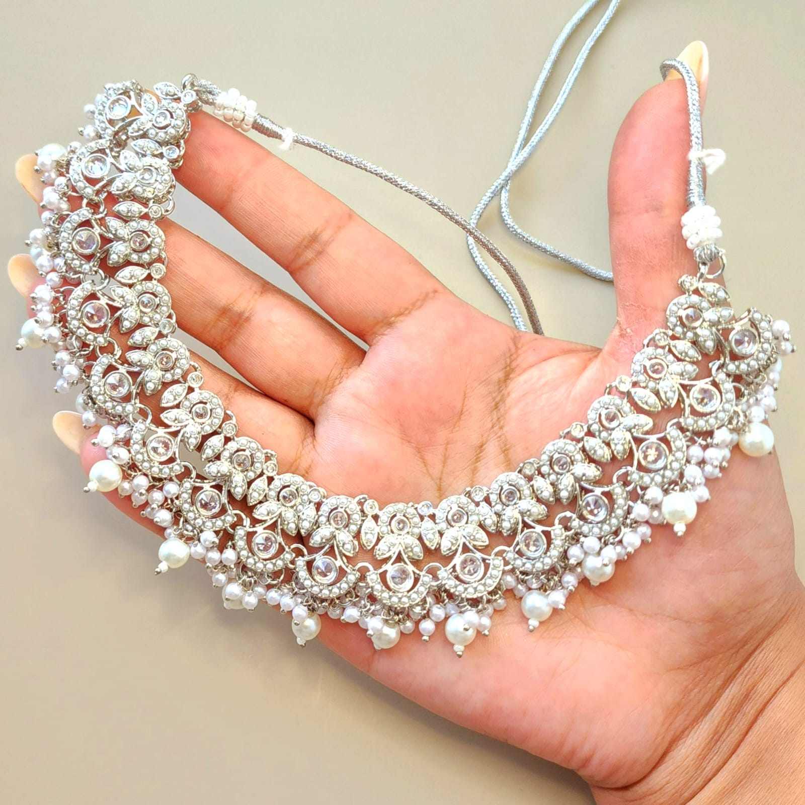 Radiate grace and grandeur with our Chandrika Polki Bridal Set—a symphony of tradition and elegance. This exquisite ensemble includes a statement necklace, matching crescent-shaped earrings, and a coordinating maang tikka, all meticulously crafted in a silver-tone finish and studded with luminous Polki stones.