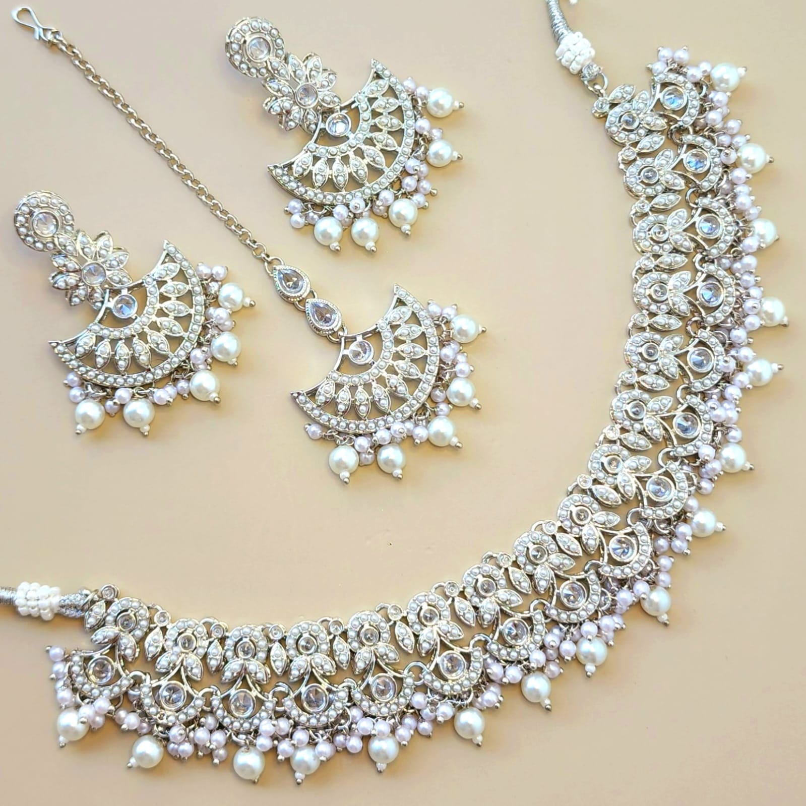 Floral and teardrop motifs bloom across the necklace, while clusters of white pearls add a soft, regal touch. The earrings and tikka mirror the design in perfect harmony, making this set ideal for brides, bridesmaids, or anyone seeking a refined festive look.