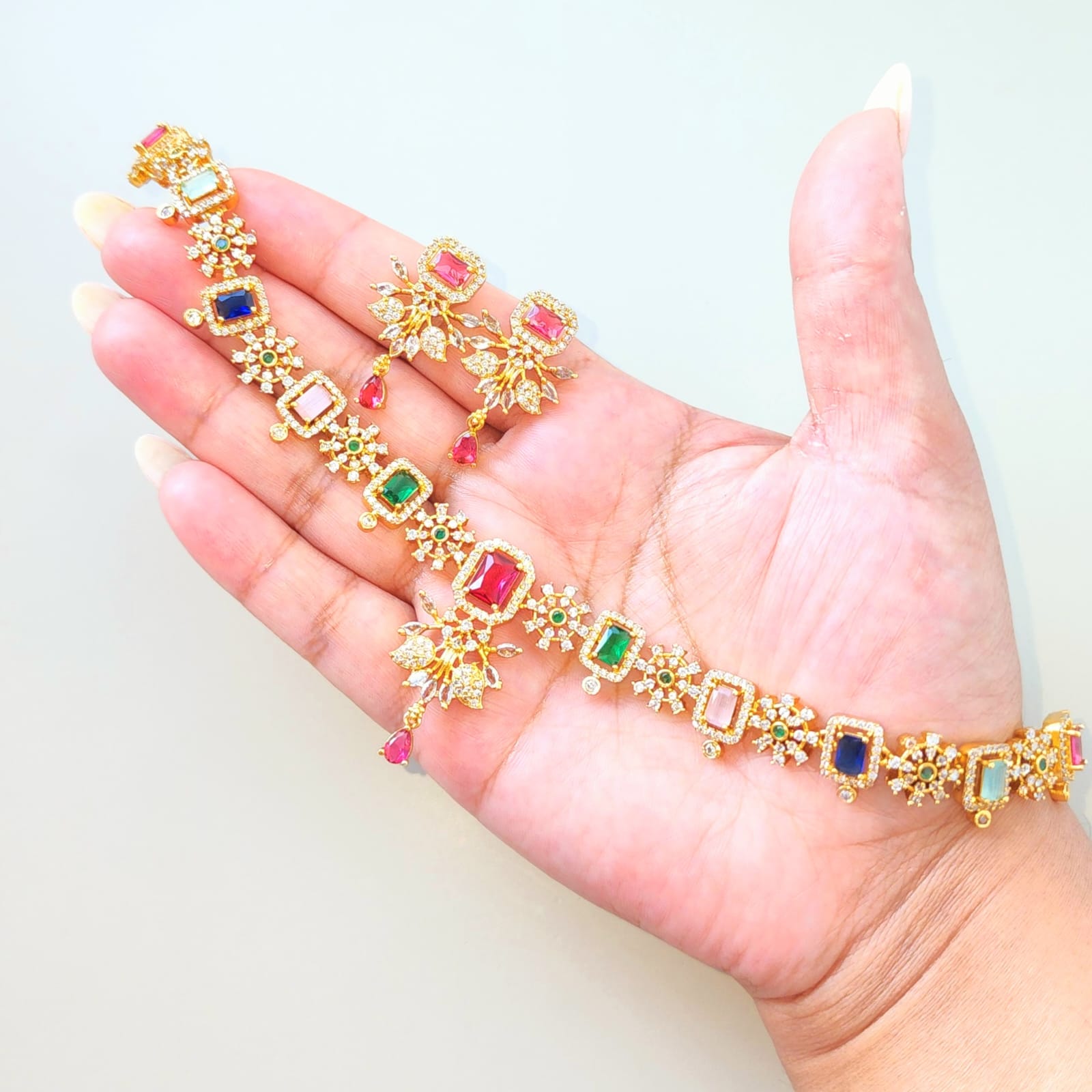 Celebrate colour, sparkle, and craftsmanship with our Jewel Symphony Necklace Set, a radiant ensemble from Eclat Indian Jewels that brings together tradition and contemporary flair. This gold-toned beauty is studded with premium CZ diamond simulants and a kaleidoscope of multicolour stones—pink, green, turquoise, red, and sapphire blue—each nestled in delicate floral and circular motifs.