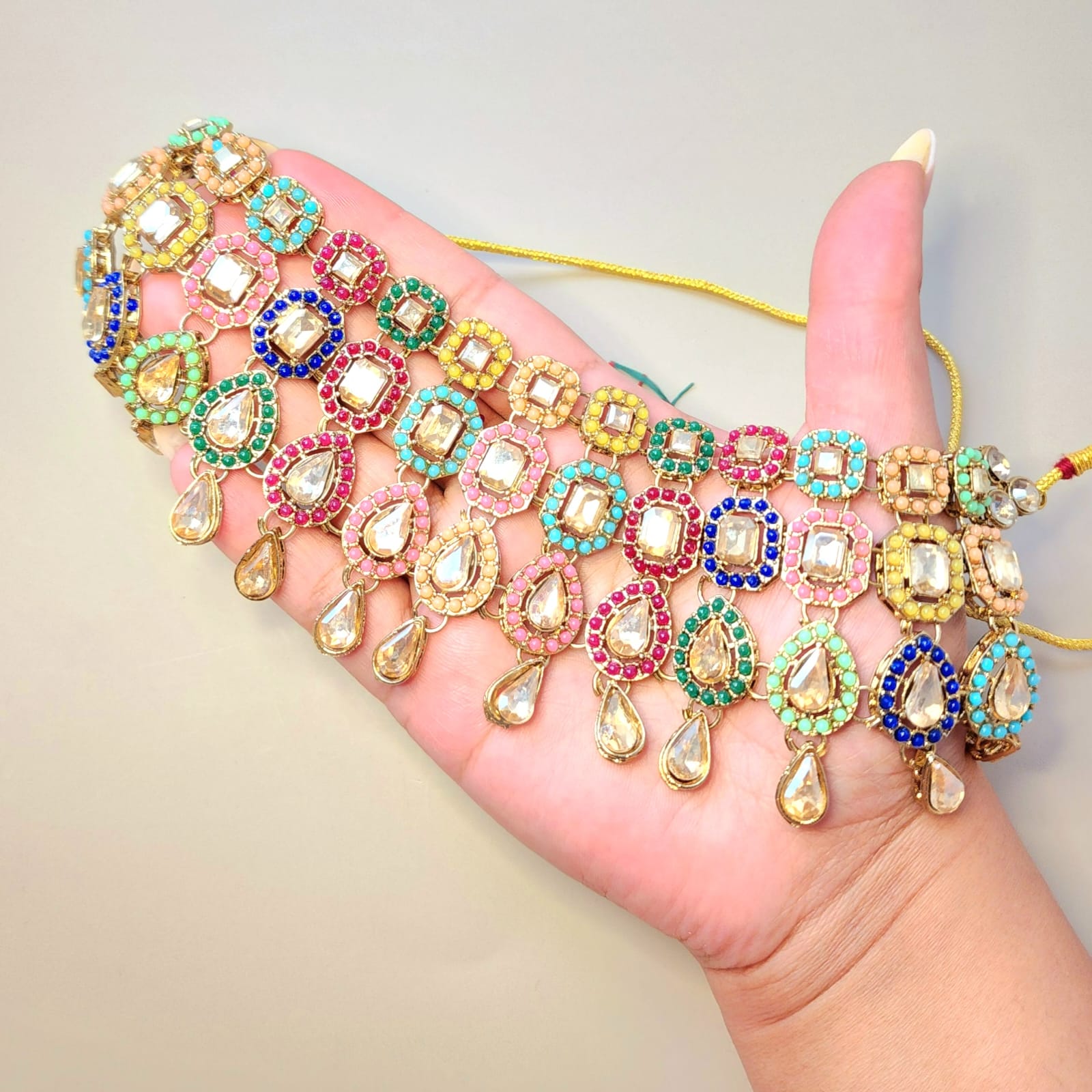 The necklace features a rhythmic arrangement of teardrop and oval motifs, adorned with vibrant polki-style stones in hues of ruby red, emerald green, sapphire blue, blush pink, and turquoise. Set against a gold-toned base, the intricate detailing and symmetrical layout evoke regal charm and festive splendor. The matching earrings mirror the necklace’s design, offering balance and elegance, while the maang tikka completes the look with a touch of ceremonial grace.