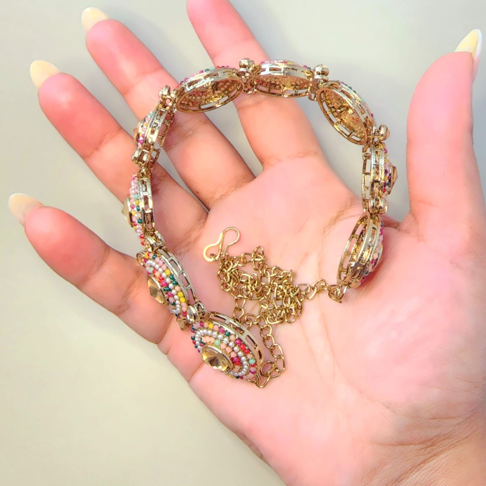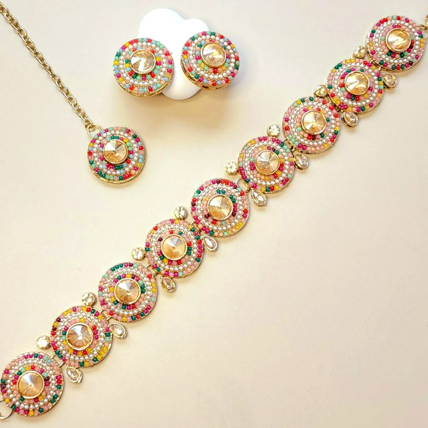 The necklace features a circular pendant design, surrounded by a mosaic of multicolored stones—ruby red, emerald green, sapphire blue, blush pink, and turquoise—set in a golden base that glows with warmth and elegance. The matching earrings echo the pendant’s vibrant motif, while the bracelet-style design adds a touch of contemporary charm. The maang tikka completes the look with ceremonial grace, making this set perfect for weddings, haldi, mehendi, or any celebration where color and culture collide.