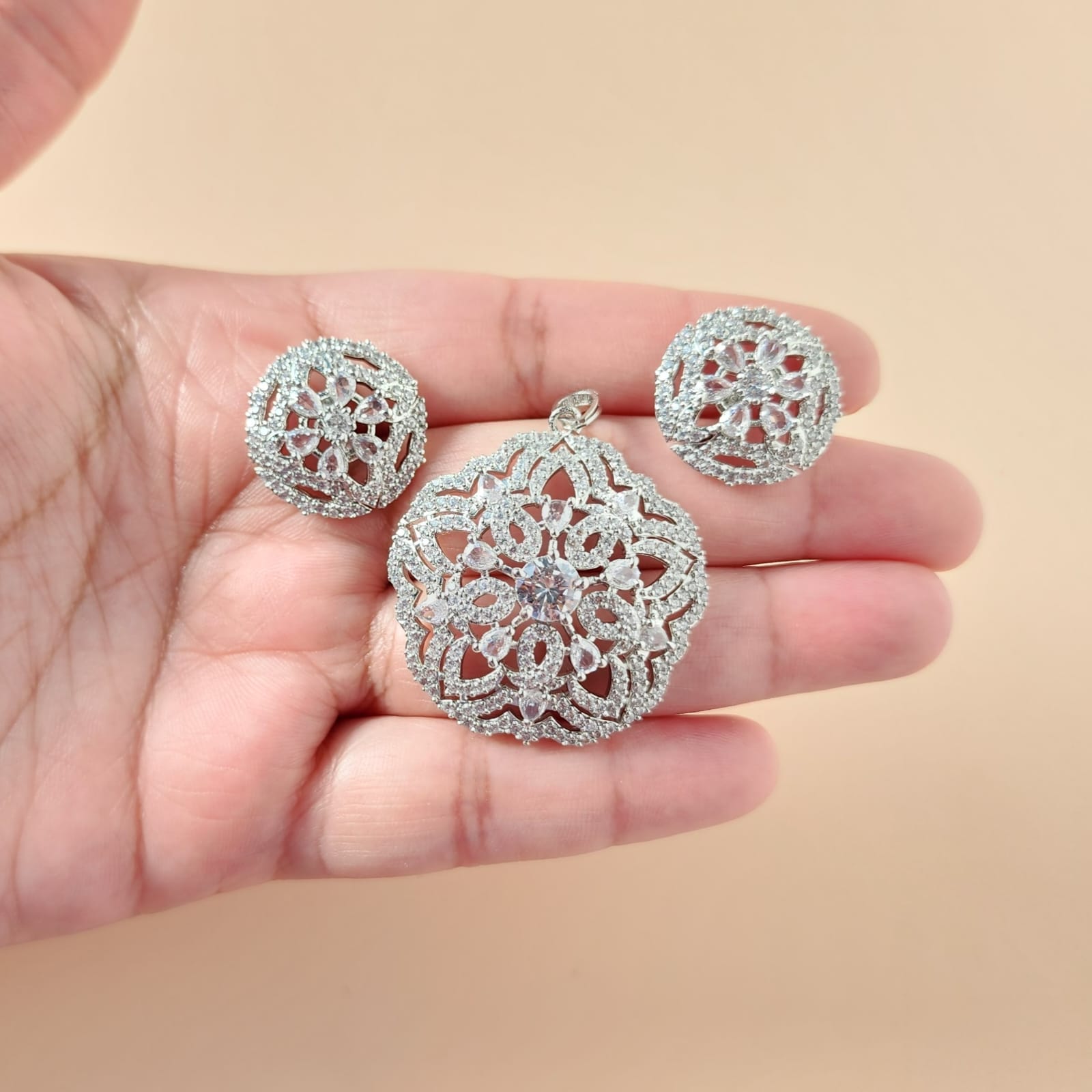 Delicate, detailed, and undeniably graceful—this pendant set from Eclat Indian Jewels is a celebration of subtle luxury. Each piece features a central white diamond framed by ornate silver-toned filigree and shimmering clear accents, creating a harmonious blend of color and sparkle. The pendant is suspended from a sleek, included chain that completes the look with effortless charm.