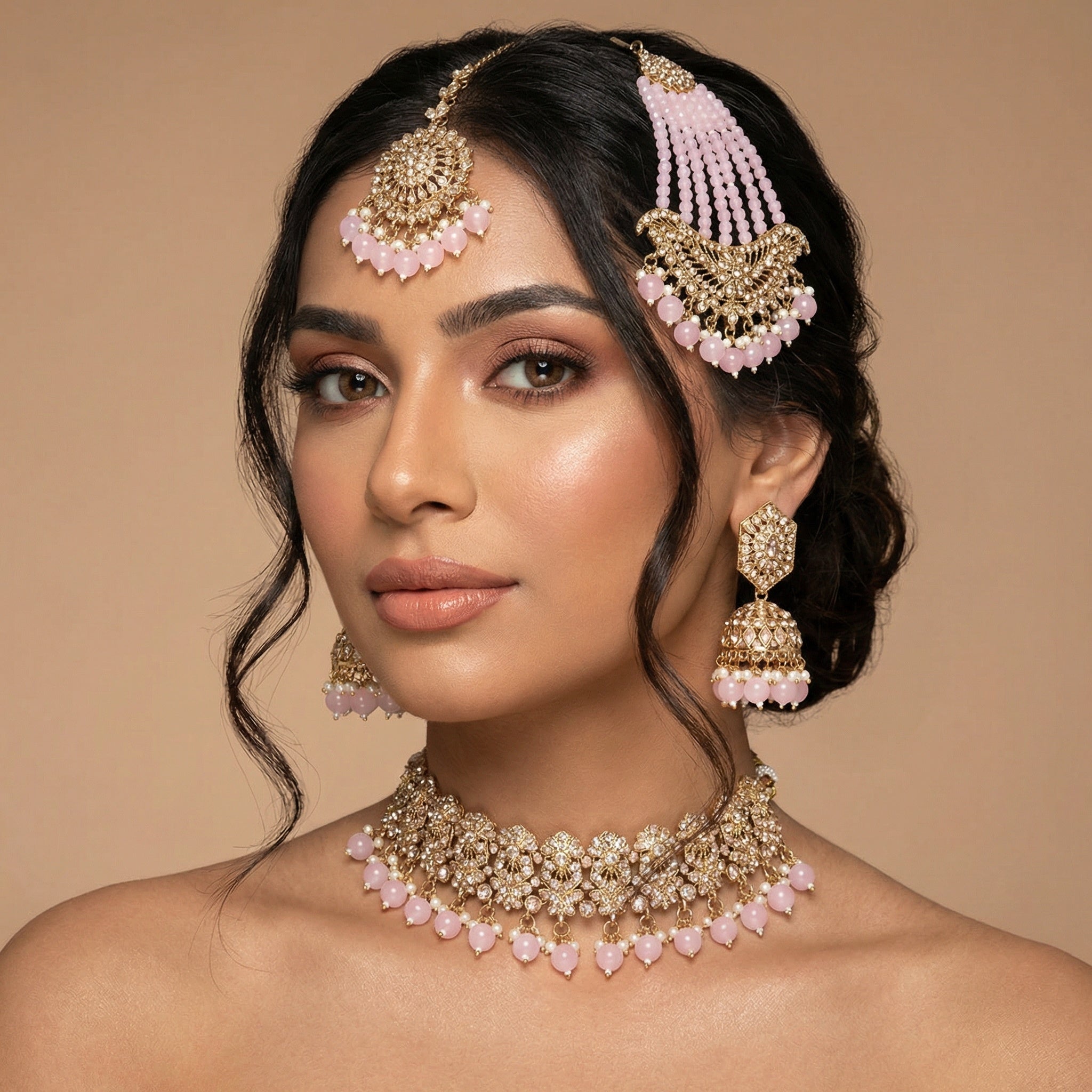 Anushka Light Pink Choker Necklace Set with Tikka & Passa