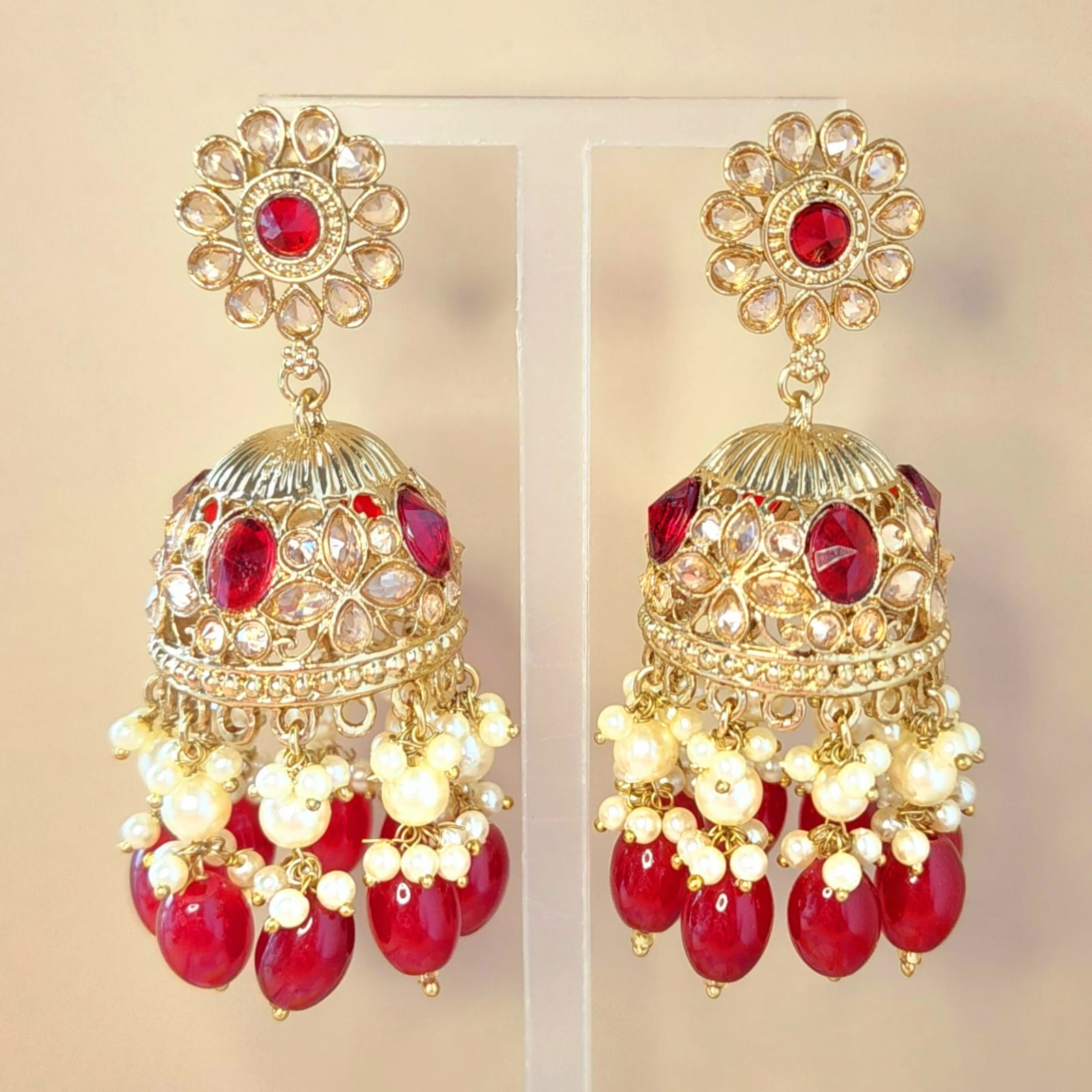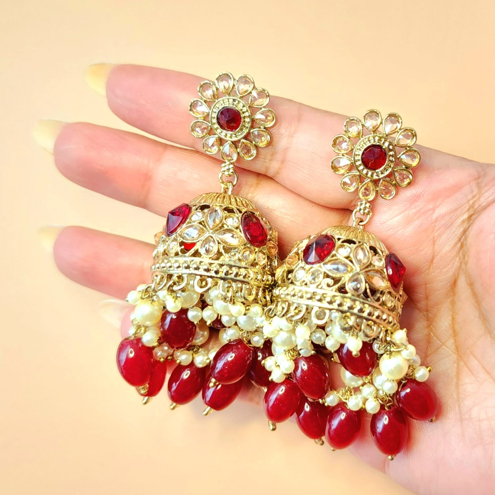 🌺 Crimson Majesty: Polki Jhumka Earrings (8 cm)