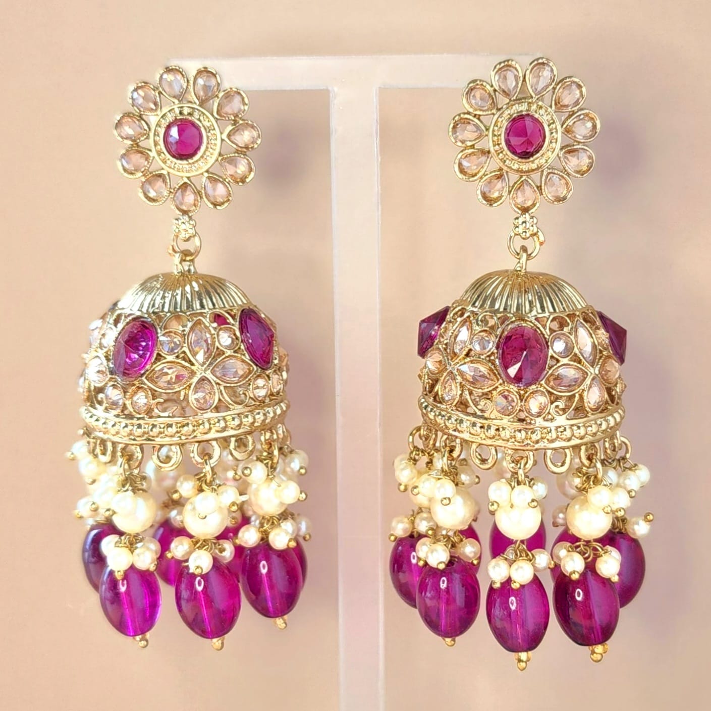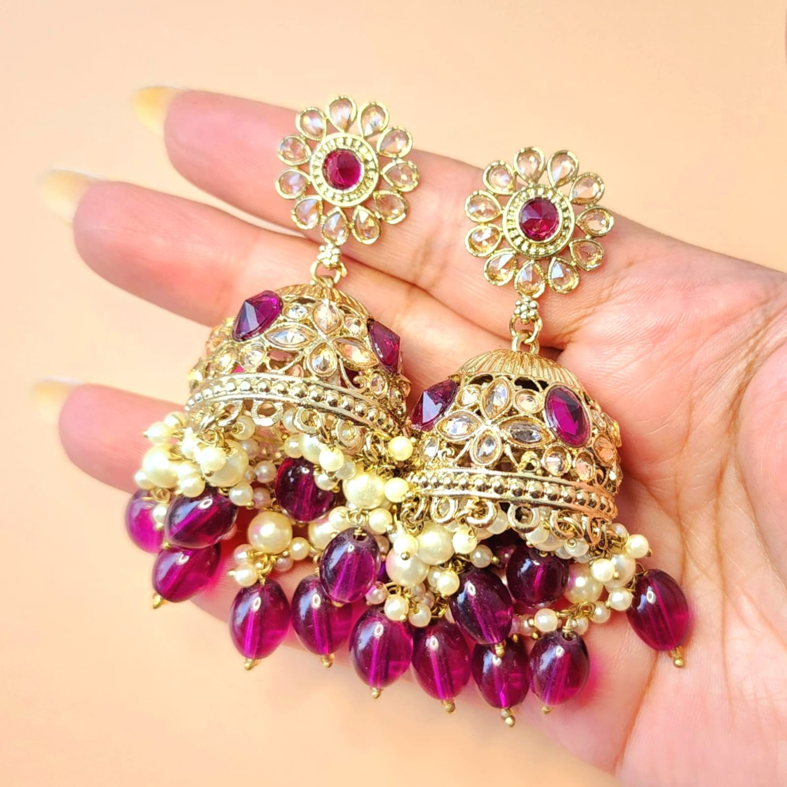 The bell-shaped jhumka cascades into a flourish of purple teardrop stones and intricate gold filigree, culminating in strands of white pearls and larger purple beads that sway with regal rhythm. These earrings are more than adornment—they’re a celebration of craftsmanship, culture, and charisma.