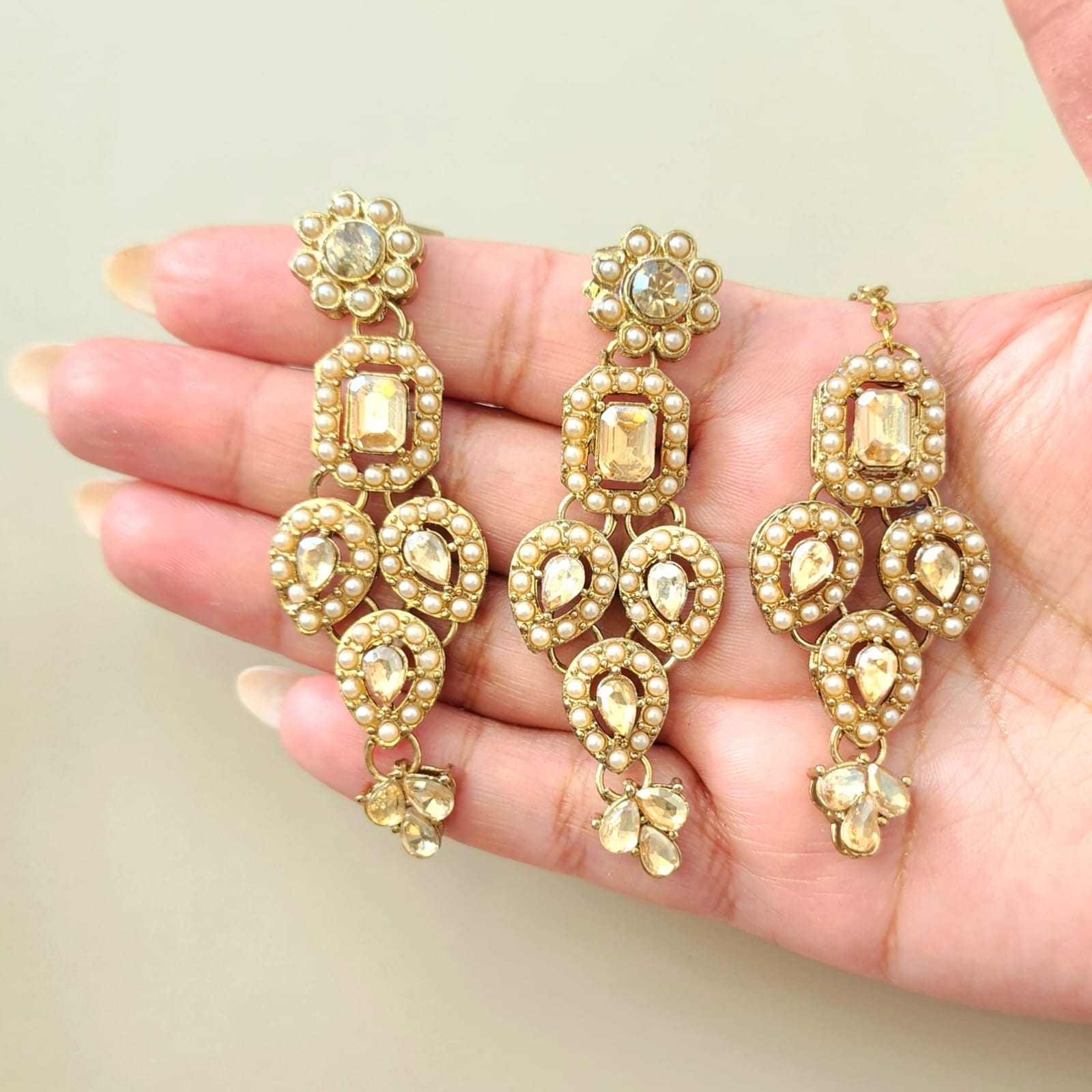 The necklace showcases a symmetrical cascade of rectangular and teardrop-shaped polki stones, set in a gold-toned base and accented with delicate dangling elements that shimmer with every movement. The matching earrings echo the necklace’s ornate design, offering balance and elegance, while the maang tikka completes the look with ceremonial charm. Embedded with high-grade white stones and intricate detailing, this set is ideal for bridal wear, festive occasions, or any moment that calls for opulence.