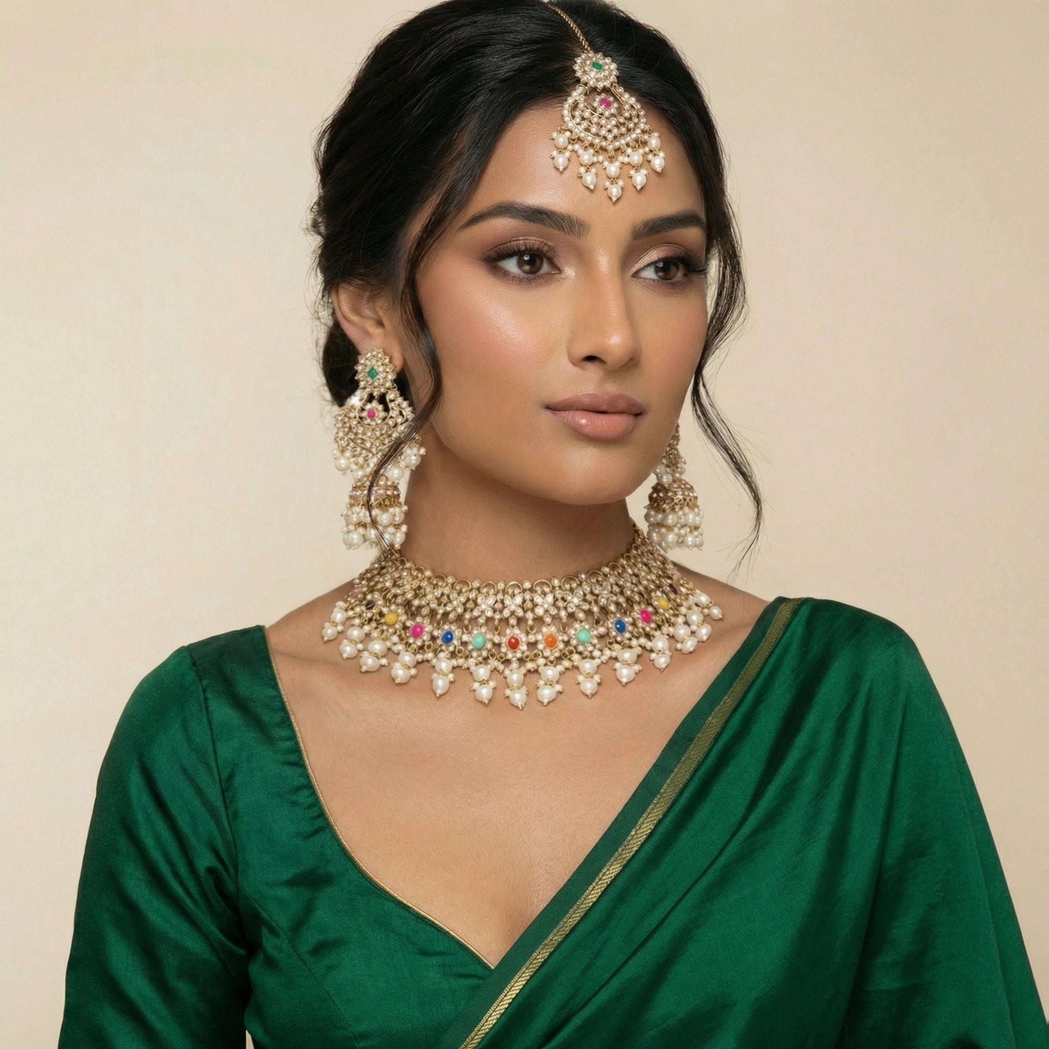 • Elegant Maang Tikka: Completing the set, the maang tikka rests gracefully on your forehead, enhancing your ethnic allure.