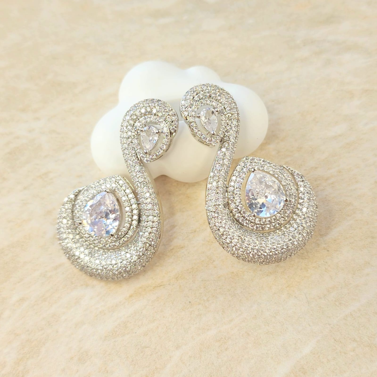 Measuring an elegant 4.7 cm in length, each piece features flawlessly cut diamond simulants that rival the fire and clarity of natural stones. The striking white rhodium plating lends a sophisticated, contemporary edge—perfectly balancing modern chic with a nod to traditional Indian artistry.