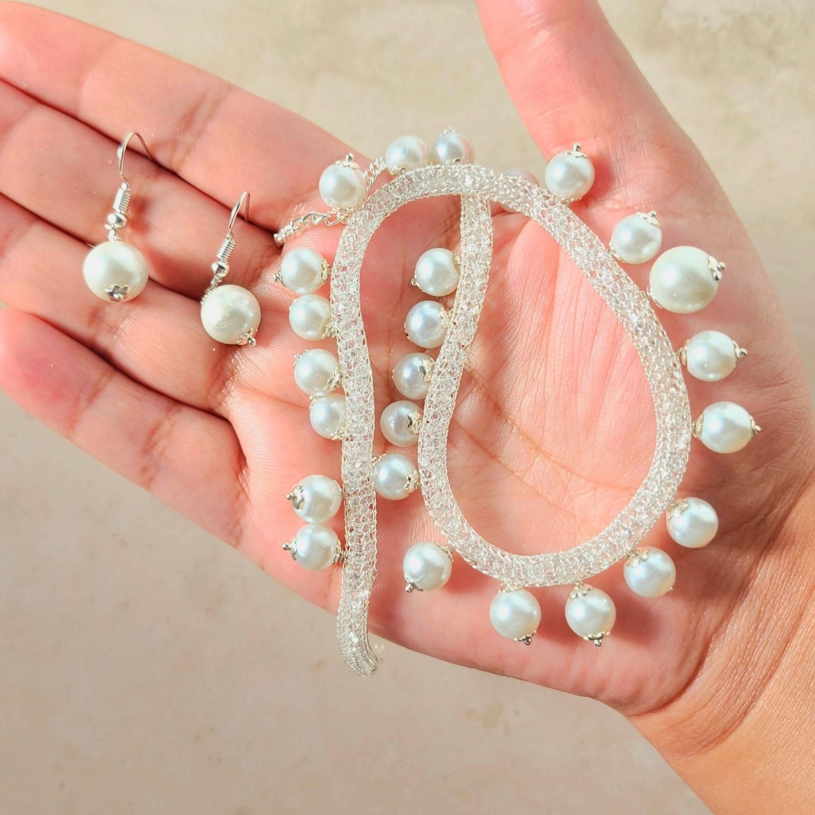 Grace meets minimalism in our Pearl Whisper Necklace Set, a delicate ensemble designed for everyday elegance. The necklace features a silver-toned chain adorned with luminous white pearls, each cradled in a classic mount that evokes timeless sophistication. Paired with matching drop-style earrings—measuring just the right length for subtle sparkle—this set is ideal for brunches, office wear, or gifting moments that call for understated beauty.