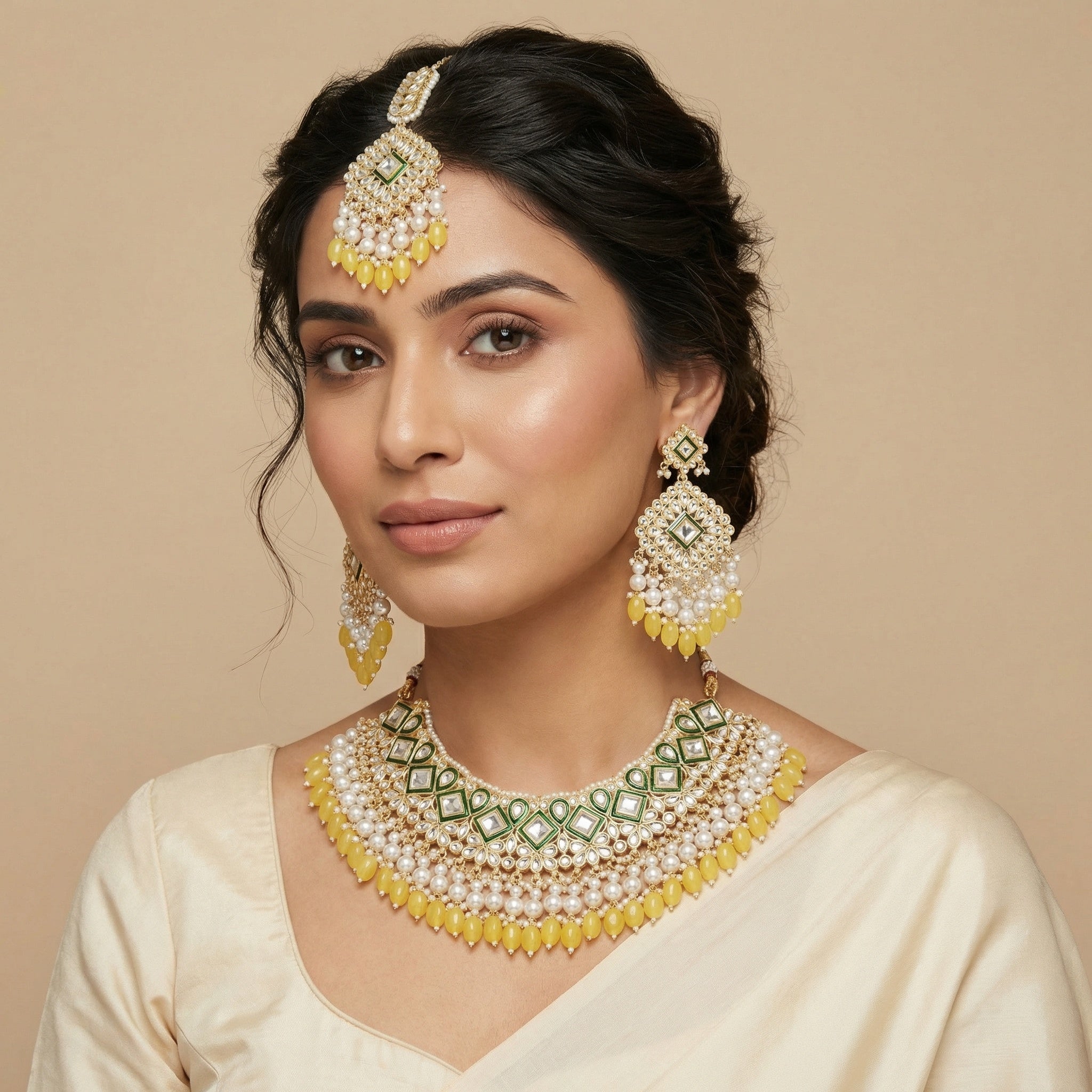 Looking for affordable Indian jewellery that still makes a statement? Check out this Kundan necklace set from Eclat Indian Jewels, cascaded with white and pale yellow and crafted in gold finish. The set also includes matching large Earrings (9cm in length) and a Maang Tikka that can be worn together or separately. This beautiful design is perfect for adding a touch of elegance to any outfit, whether you're attending a wedding or a festive event. Don't miss out on this must-have piece of jewellery!.