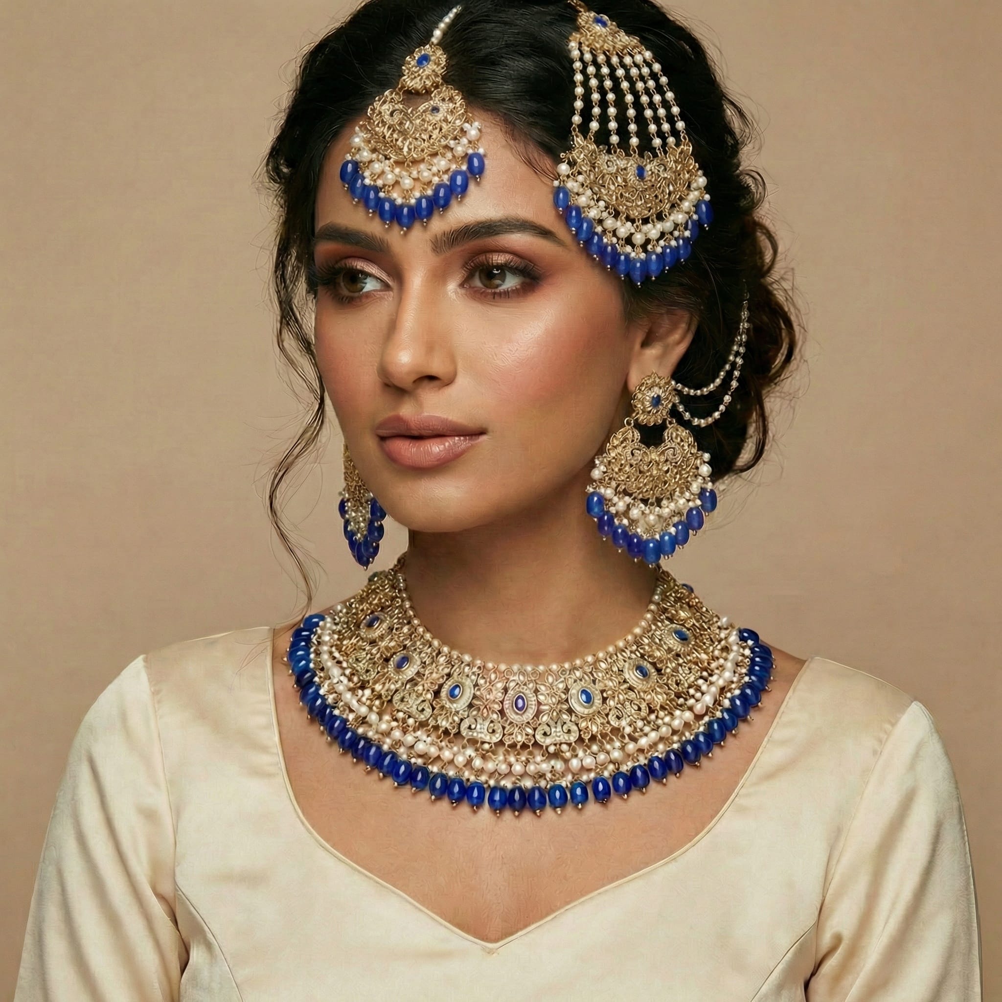 Adele Blue Polki Necklace Set with Maang Tikka & Passa (Jhoomer)
