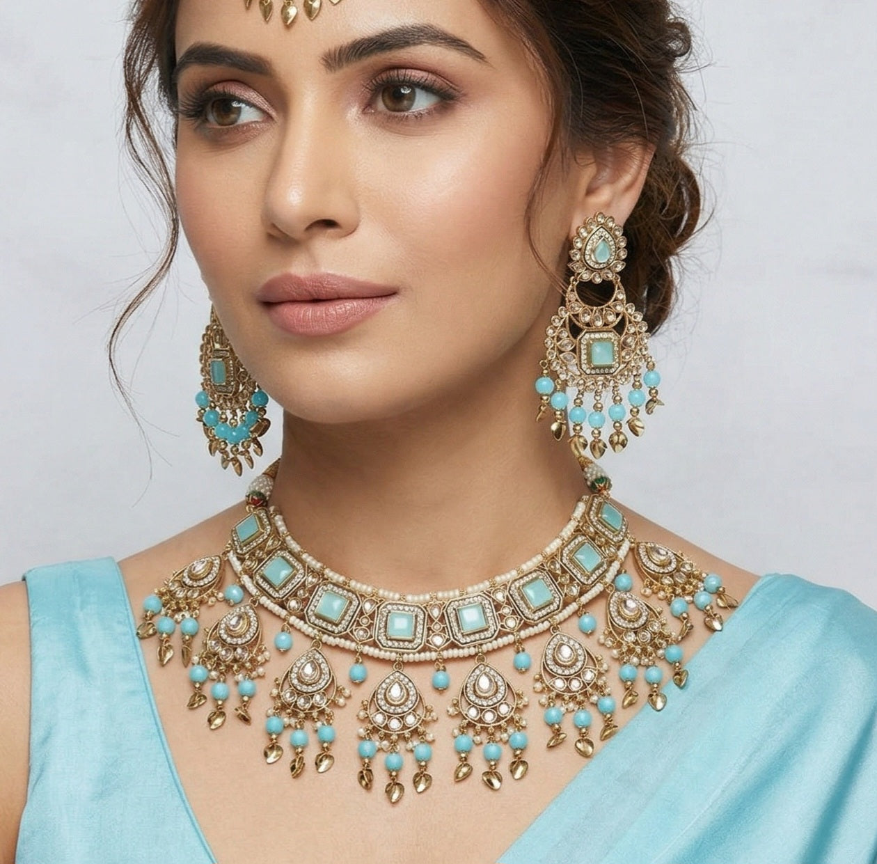 Introducing the exquisite necklace set from Eclat Indian Jewels! This stunning set includes a beautifully crafted necklace, a pair of matching earrings, and a maang tikka. Each piece is designed to make you stand out on any special occasion. The necklace features intricate detailing adorned with vibrant light blue stones, creating a regal and luxurious look. The matching earrings, measuring 9cm in length, are equally captivating with their elaborate design and sparkling embellishments. The maang tikka completes the set, adding a touch of grace and charm to your overall appearance.