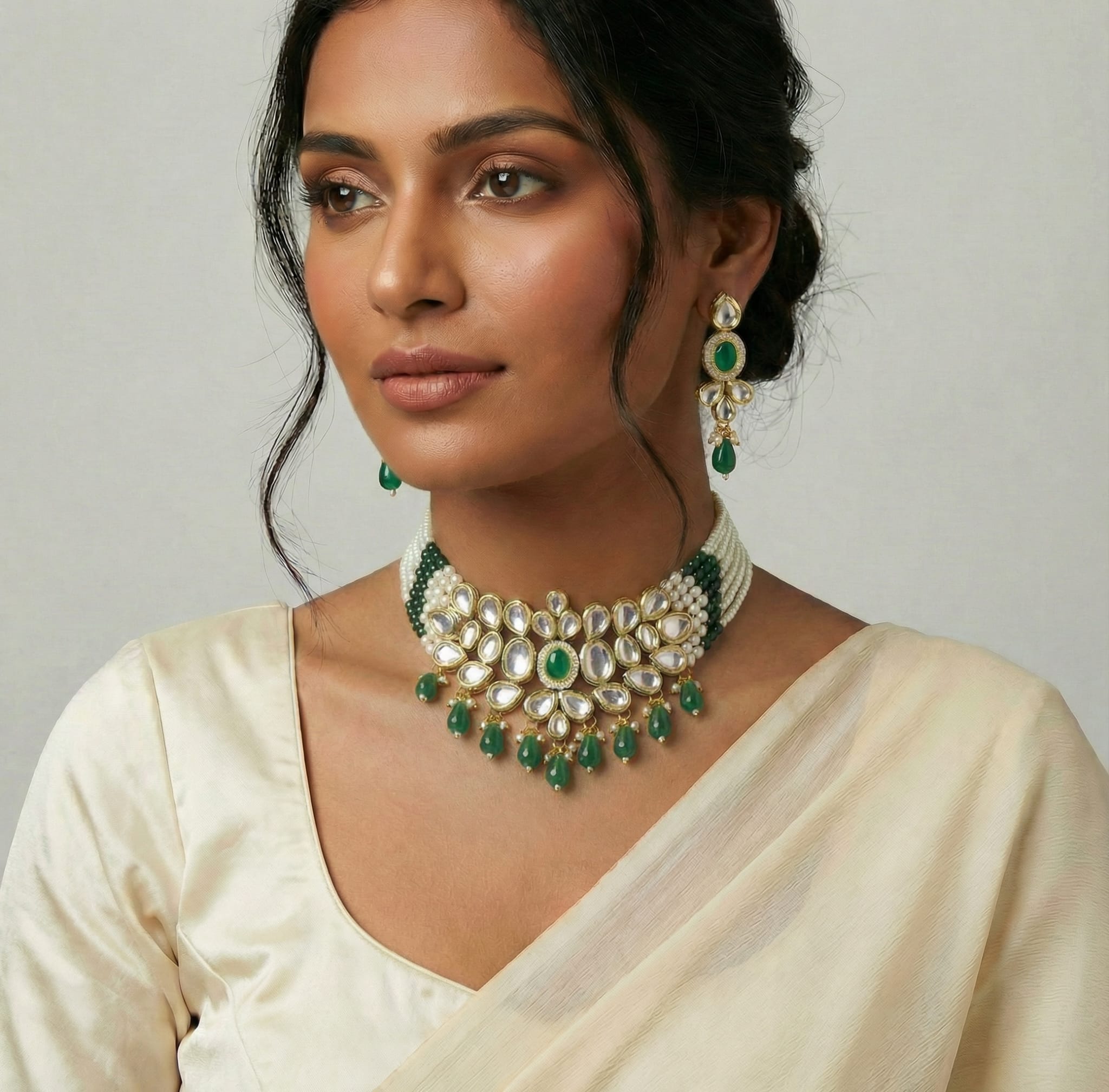 Elevate your style and captivate hearts with the Kundan Choker Set—a mesmerizing fusion of tradition, elegance, and allure.