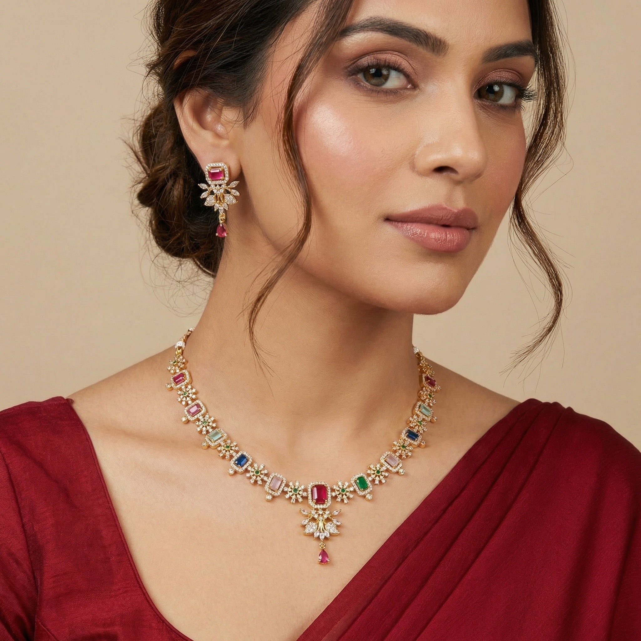 Celebrate colour, sparkle, and craftsmanship with our Jewel Symphony Necklace Set, a radiant ensemble from Eclat Indian Jewels that brings together tradition and contemporary flair. This gold-toned beauty is studded with premium CZ diamond simulants and a kaleidoscope of multicolour stones—pink, green, turquoise, red, and sapphire blue—each nestled in delicate floral and circular motifs.