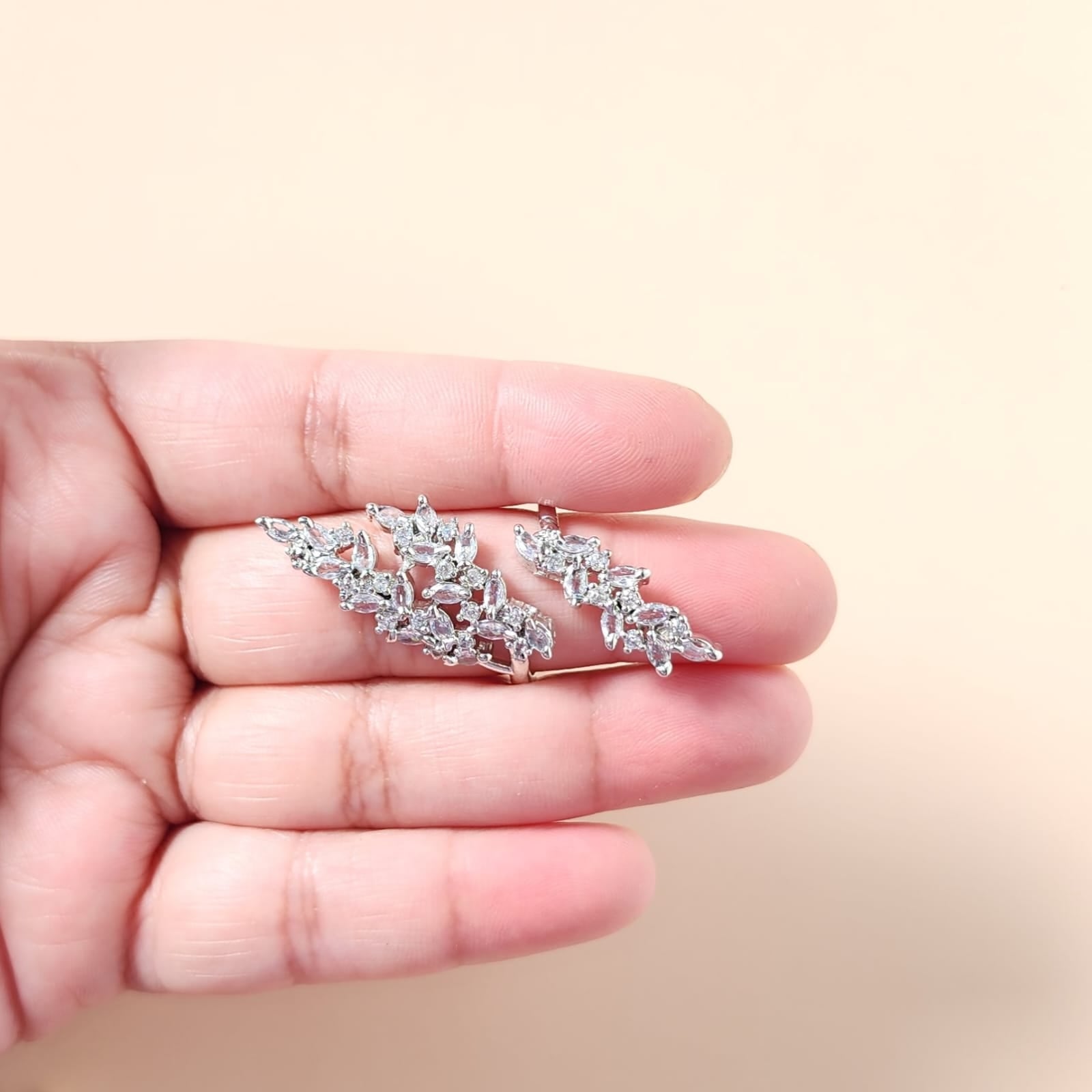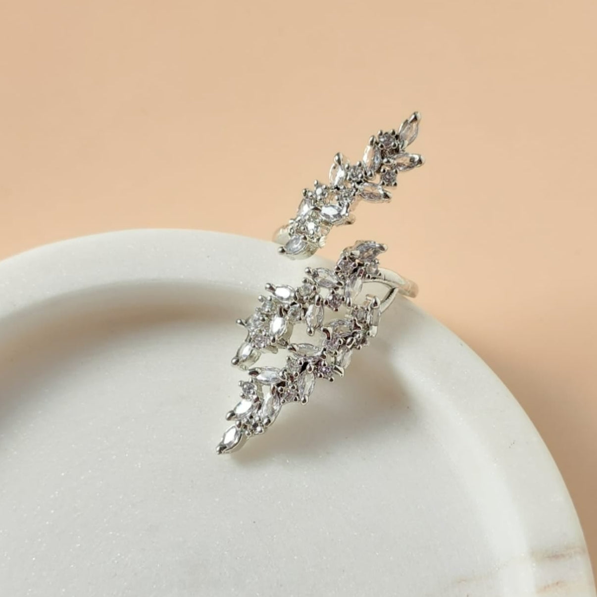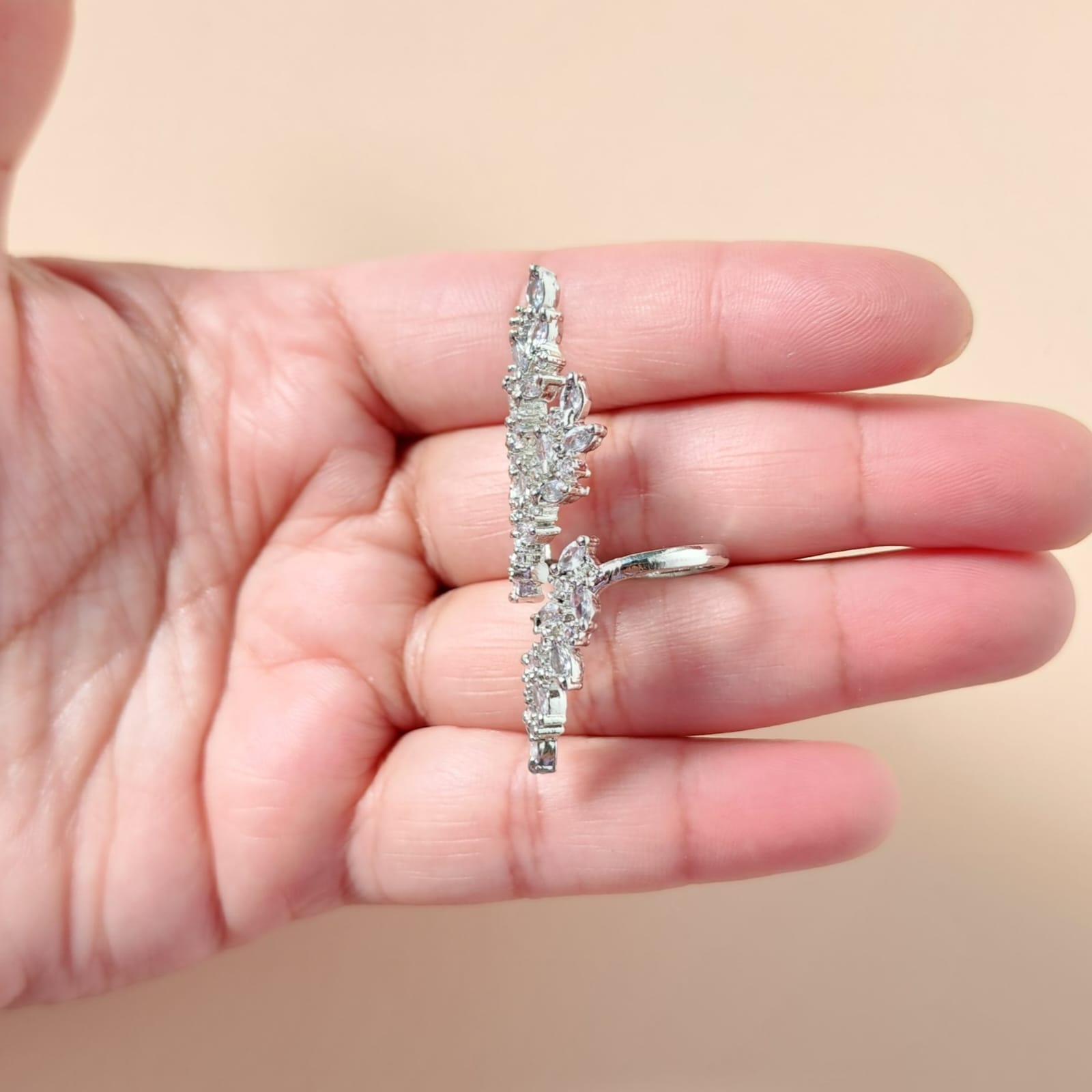 Delicate yet dazzling, this silver ring from Eclat Indian Jewels is a tribute to nature’s quiet elegance. Designed with a graceful leaf-like arrangement of marquise-cut clear stones, each gem catches the light with ethereal brilliance. The intricate setting and polished silver band create a look that’s both refined and romantic—perfect for those who appreciate understated luxury.