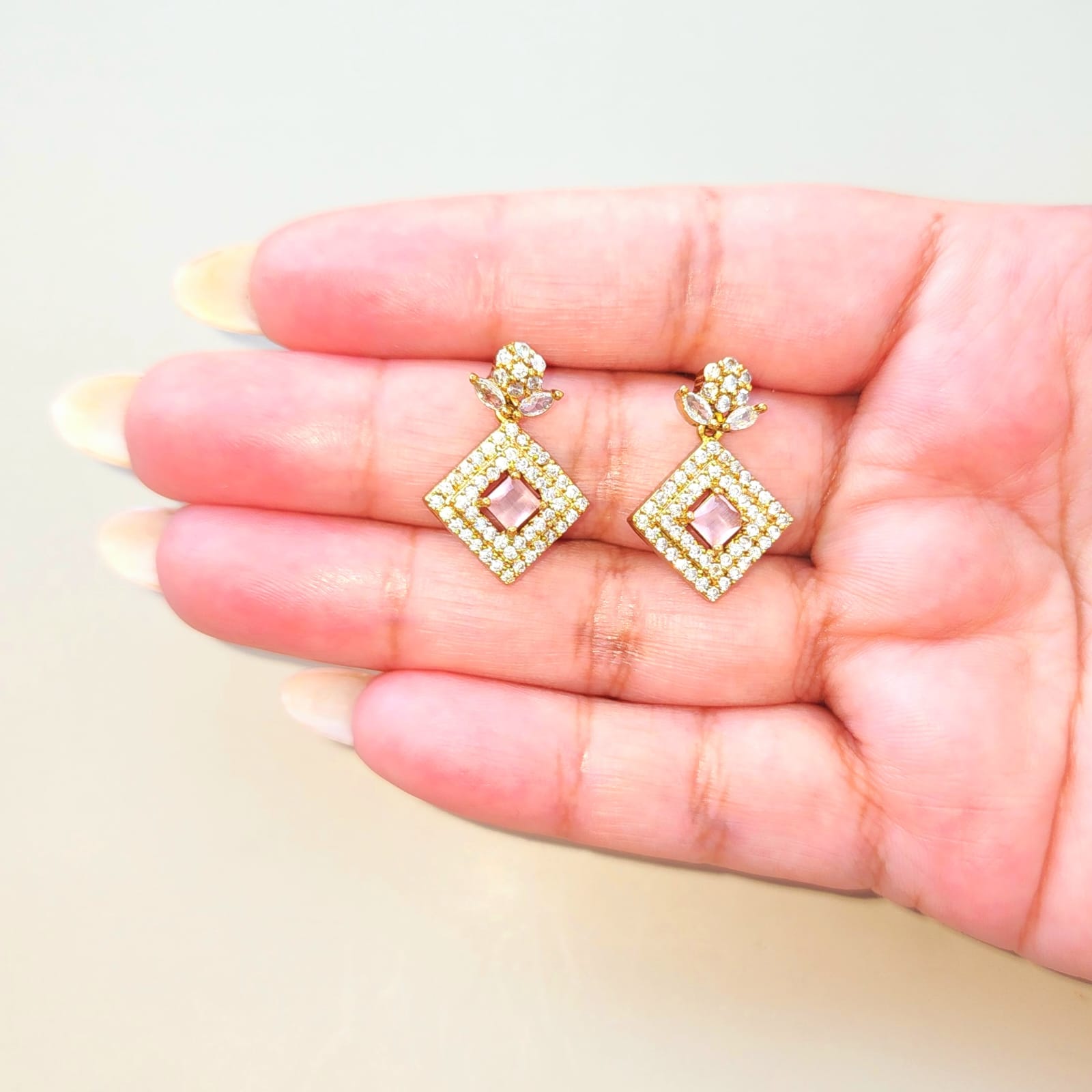 The matching earrings echo the pendant’s design with square silhouettes, pink center stones, and a halo of white CZs, offering a cohesive and elegant look ideal for festive occasions, bridal wear, or graceful day-to-evening transitions.