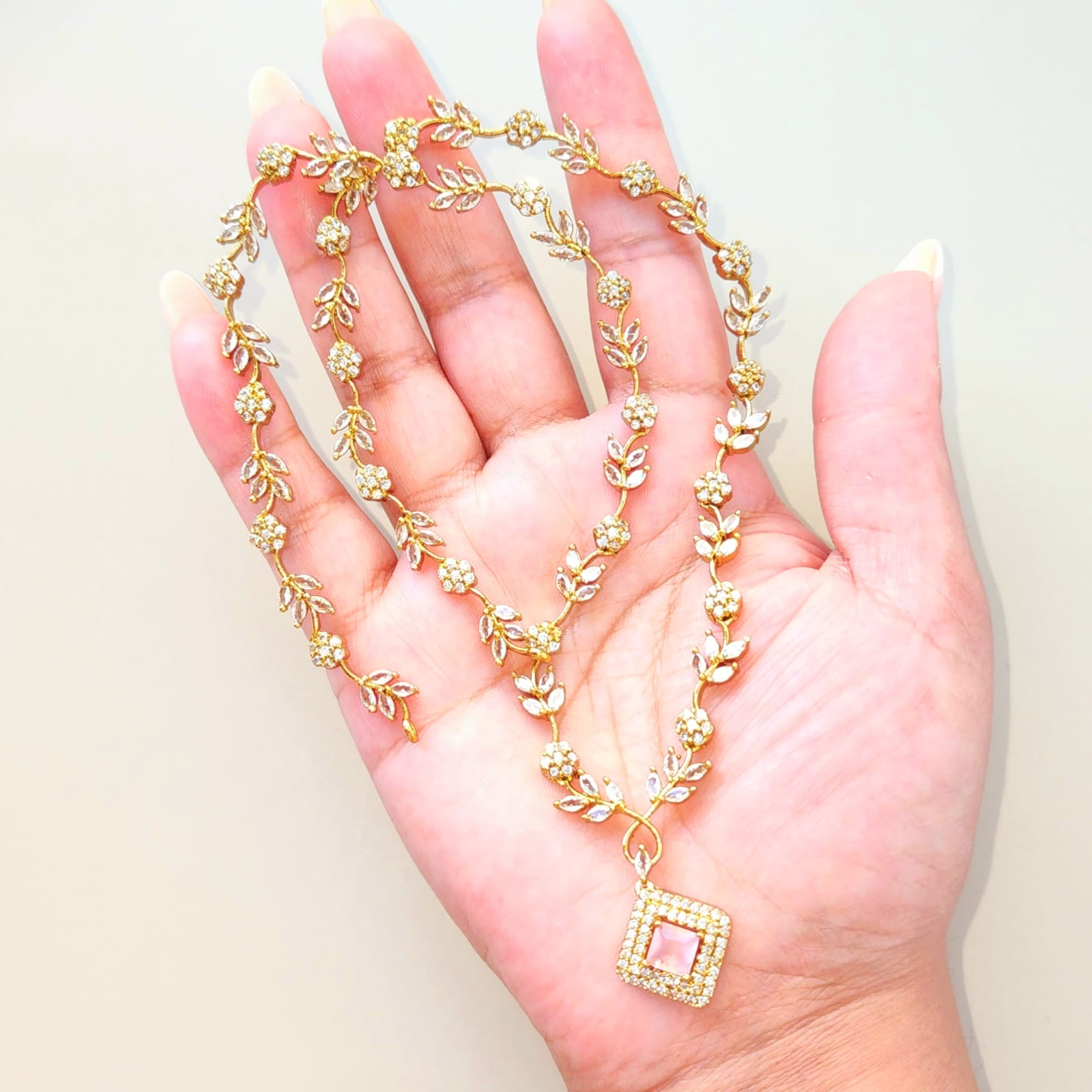 Grace your neckline with the Rosé Radiance Necklace Set, a delicate yet dazzling creation from Eclat Indian Jewels. This gold-toned long necklace is adorned with alternating leaf and bead motifs, leading to a square pendant featuring a soft pink gemstone surrounded by shimmering CZ diamond simulants—a perfect blend of subtle charm and radiant sparkle.
