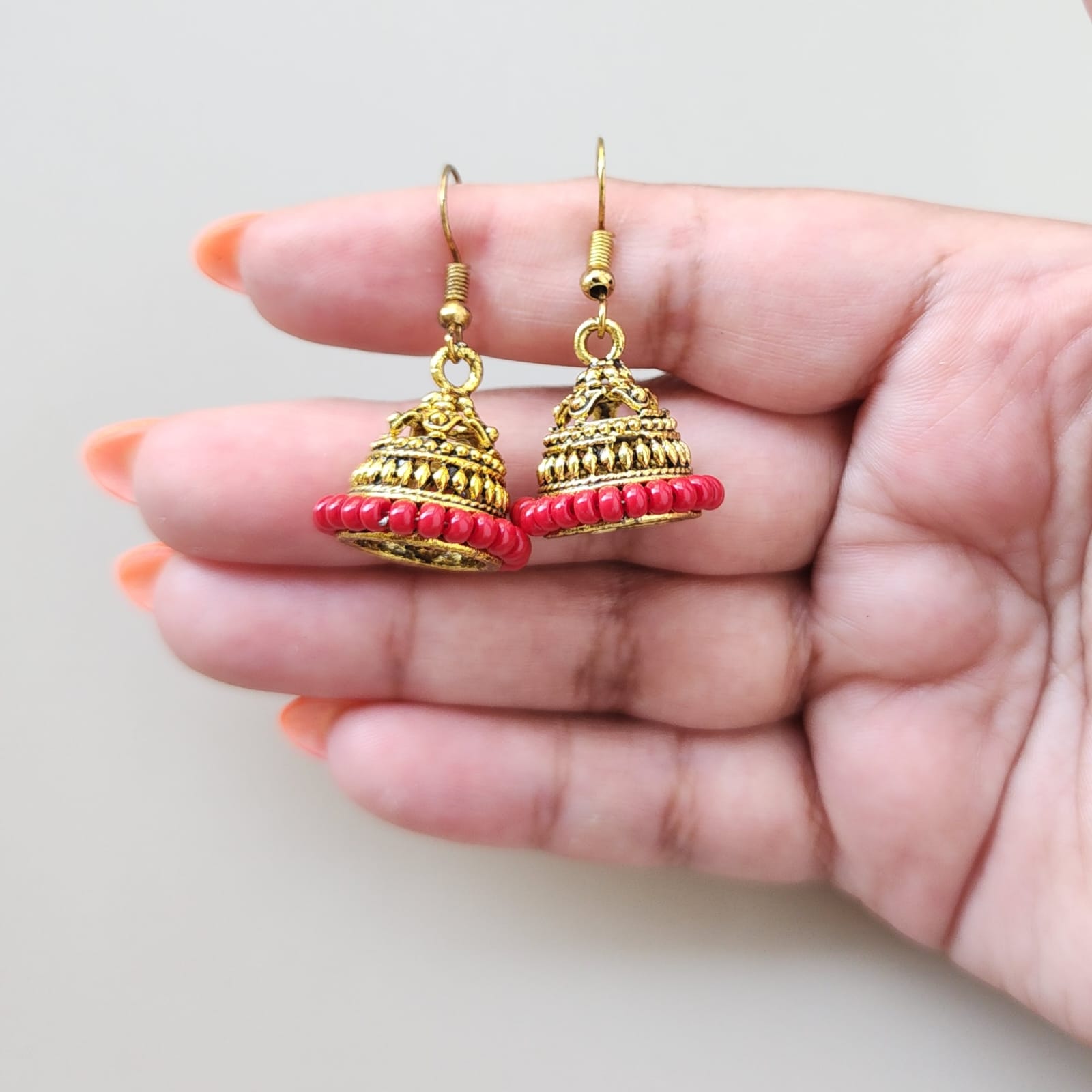 Introducing the exquisite Mini Jhumkas from Eclat Indian Jewels, a perfect blend of traditional charm and modern elegance. These stunning earrings feature a vibrant gold dome adorned with intricate golden floral motifs, adding a touch of whimsy and sophistication. The base of the jhumkis is embellished with a fringe of lustrous dark red pearls, creating a beautiful contrast and enhancing the overall allure. The earrings are designed with a gold-toned hook for easy wear and a secure fit. These mini jhumkas are ideal for adding a pop of color and a hint of tradition to any outfit, making them a versatile addition to your jewellery collection. Embrace the essence of traditional Indian jewelry and buy Indian jewellery online from Eclat Indian Jewels to add a touch of timeless beauty to your collection.