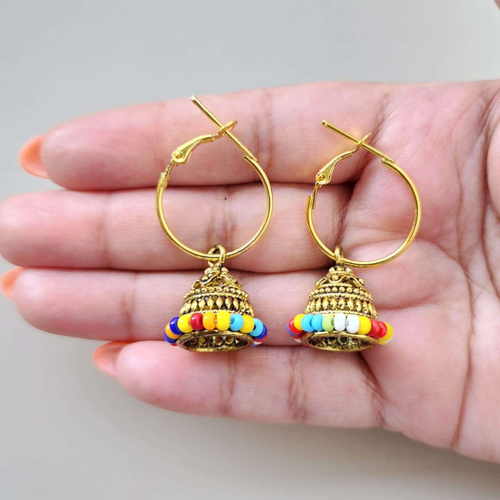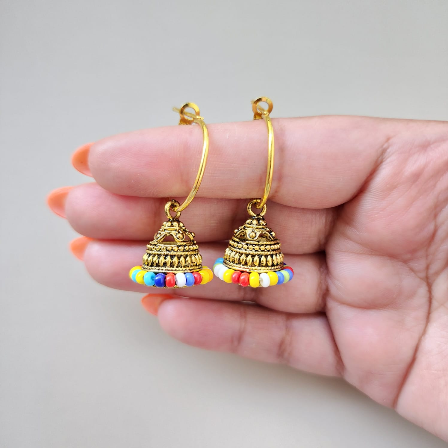 Introducing the exquisite Mini Jhumkas from Eclat Indian Jewels, a perfect blend of traditional charm and modern elegance. These stunning earrings feature a vibrant gold dome adorned with intricate golden floral motifs, adding a touch of whimsy and sophistication. The base of the jhumkis is embellished with a fringe of lustrous multicolour pearls, creating a beautiful contrast and enhancing the overall allure. The earrings are designed with a gold-toned hook for easy wear and a secure fit. These mini jhumkas are ideal for adding a pop of color and a hint of tradition to any outfit, making them a versatile addition to your jewellery collection. Embrace the essence of traditional Indian jewelry and buy Indian jewellery online from Eclat Indian Jewels to add a touch of timeless beauty to your collection.
