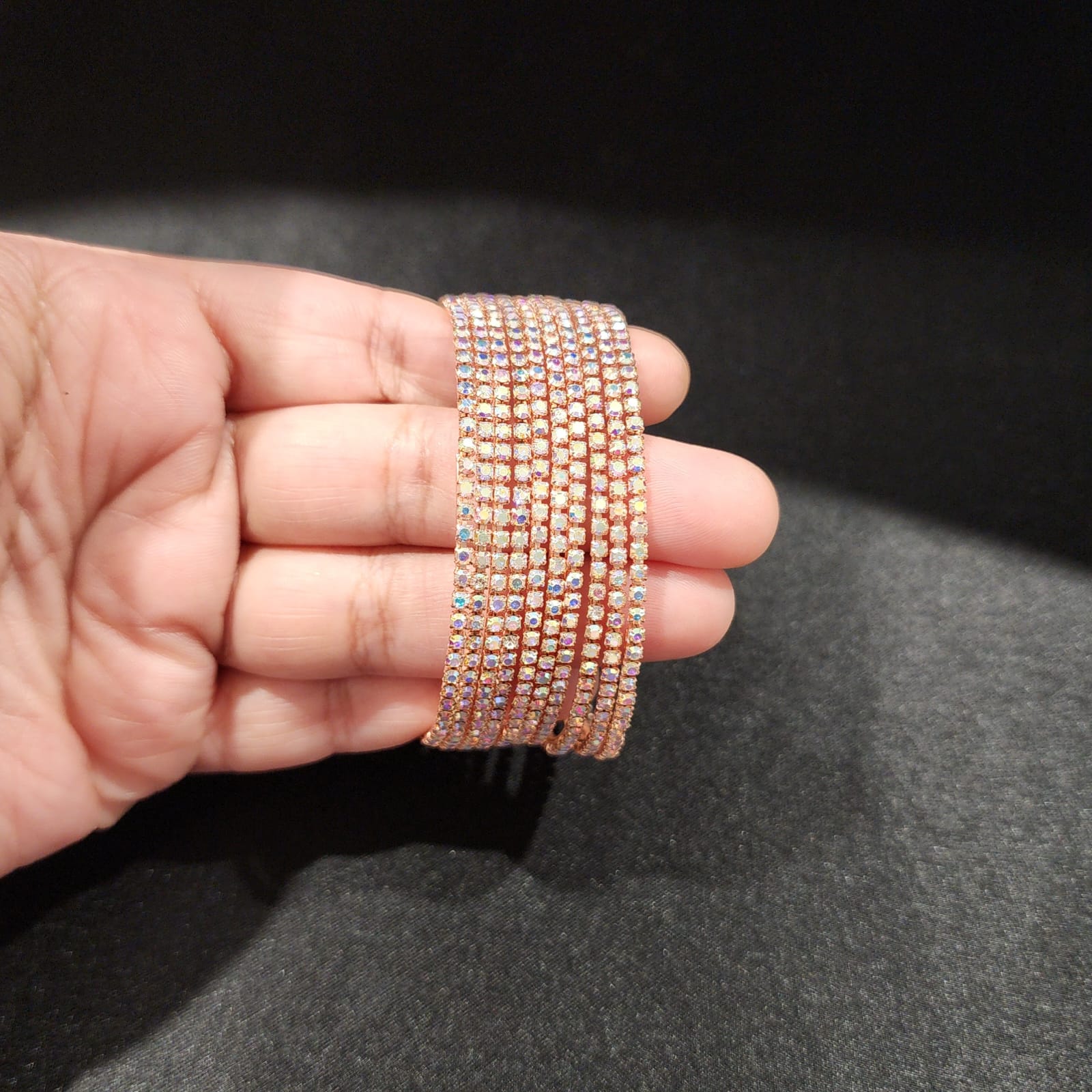 Elevate your ensemble with this exquisite set of 10 bangles, masterfully crafted to embody timeless grace and modern allure. Each bangle gleams in a rich rose gold finish, adorned with meticulously set sparkling stones that catch the light with every movement. The symmetrical design and intricate detailing reflect the finesse of traditional Indian artistry, reinterpreted for today’s discerning wearer.