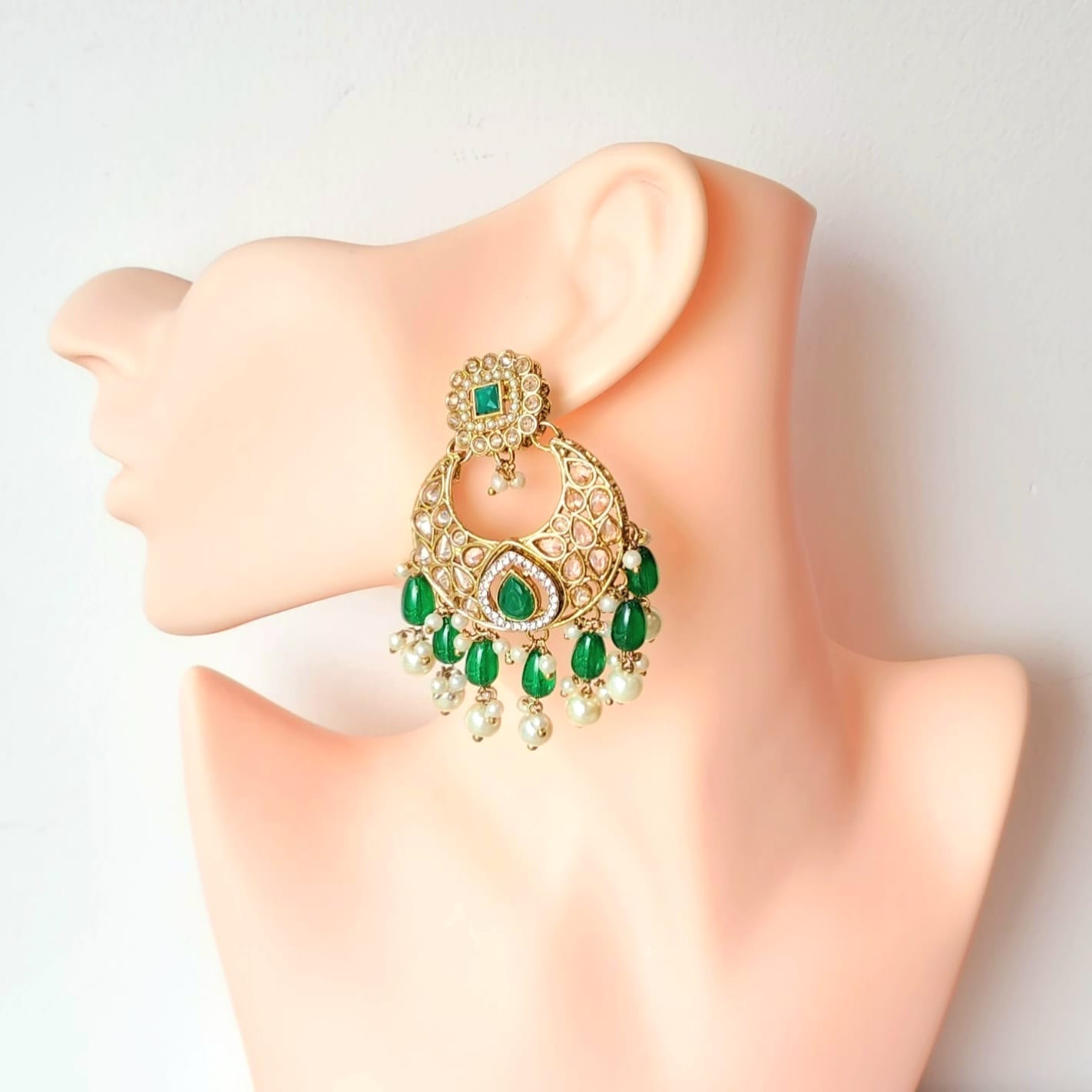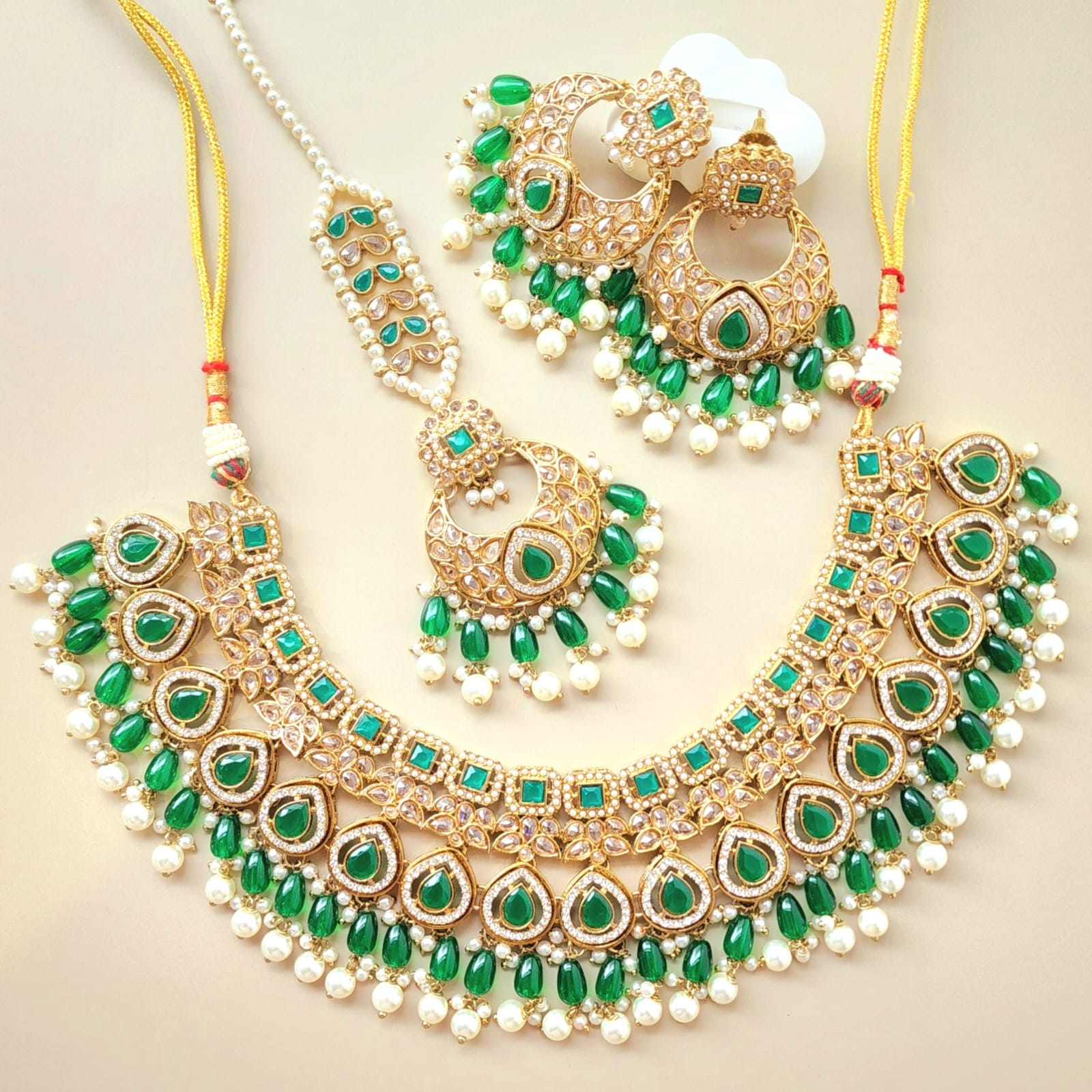 • Maang Tikka: Completing the set, the maang tikka features a central polki-encrusted motif with suspended pearl-like beads. Ideal for weddings and special occasions.