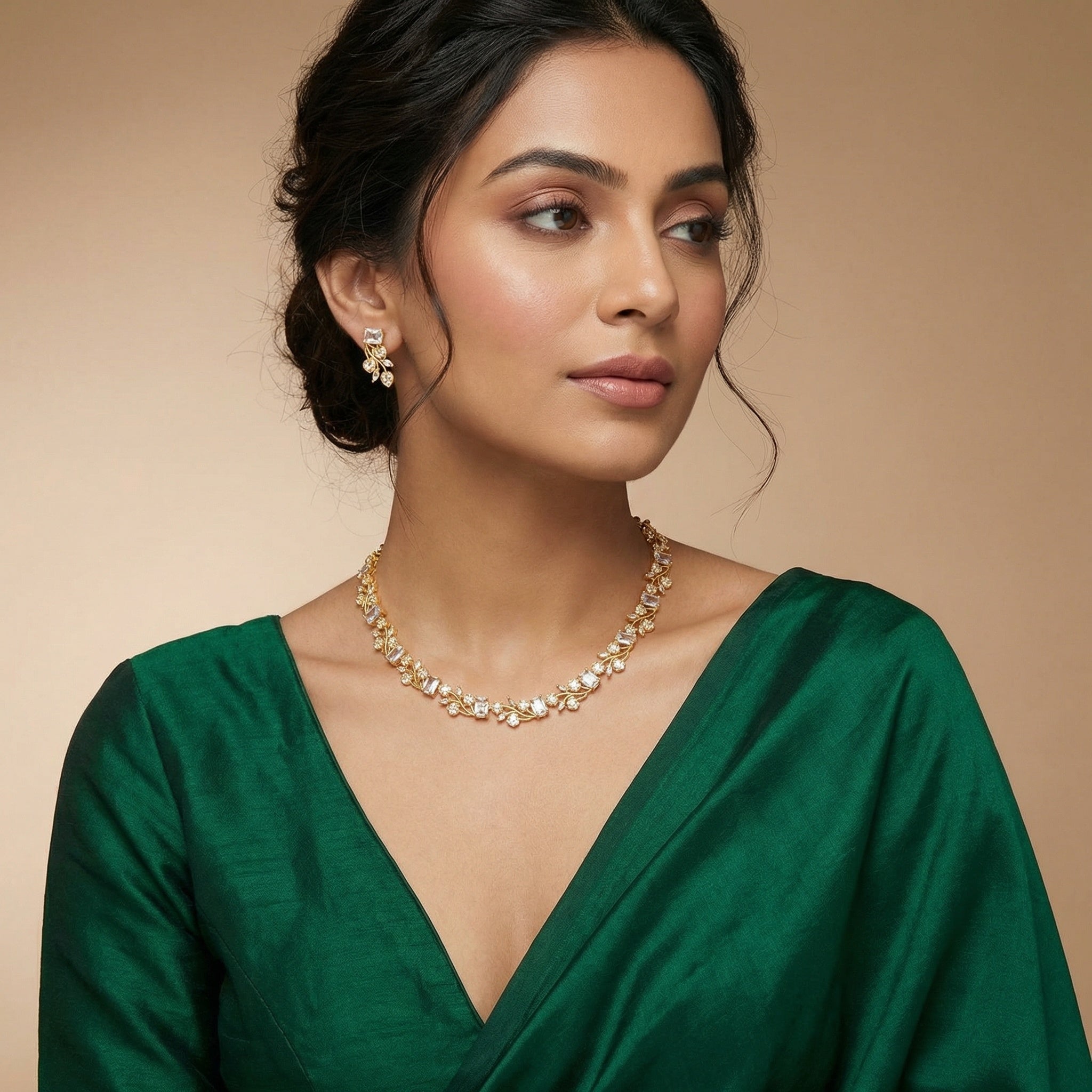 The necklace features rectangular clear white stones, each framed by delicate gold detailing that catches the light with every movement. The matching earrings, measuring 2.3 cm, mirror the necklace’s charm with petite leaf accents and clear white stones—perfect for adding a pop of color to your festive or formal ensemble.