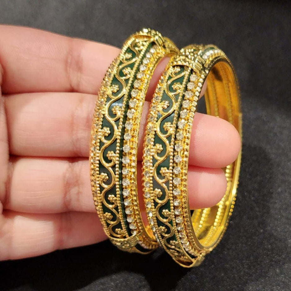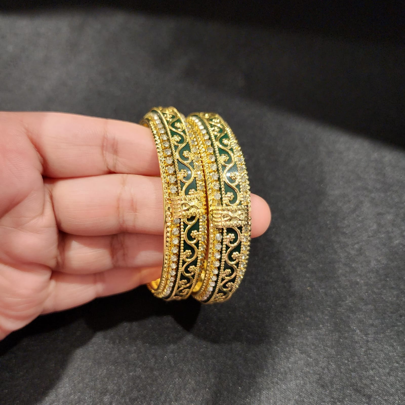 Infuse your ensemble with the warmth of tradition and the brilliance of artistry with our Sindoori Splendor Bangles. This non-openable pair, finished in radiant gold, is adorned with intricate green and gold detailing that evokes the grandeur of festive rituals and bridal finery.